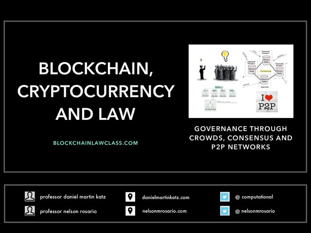 This session will continue with our building blocks of crypto infrastructure. Here we will explore governance regimes (protocols) that leverage Crowds, Consensus and Peer to Peer Networks.