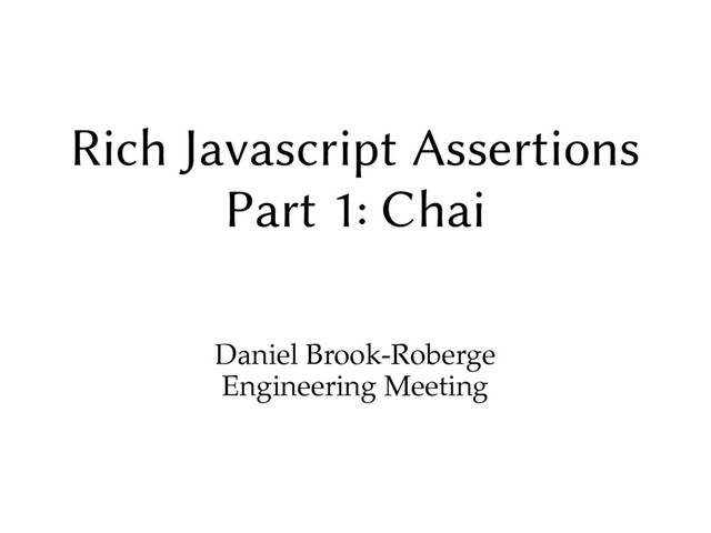 of test assertions. • Beyond the “basic” assertions of truth, falseness, equality, and type, we have “rich” assertions which assert something more specific. • Rich assertions allow both clearer code and more explanatory error messages on failure. • This talk describes some rich assertions in Chai.