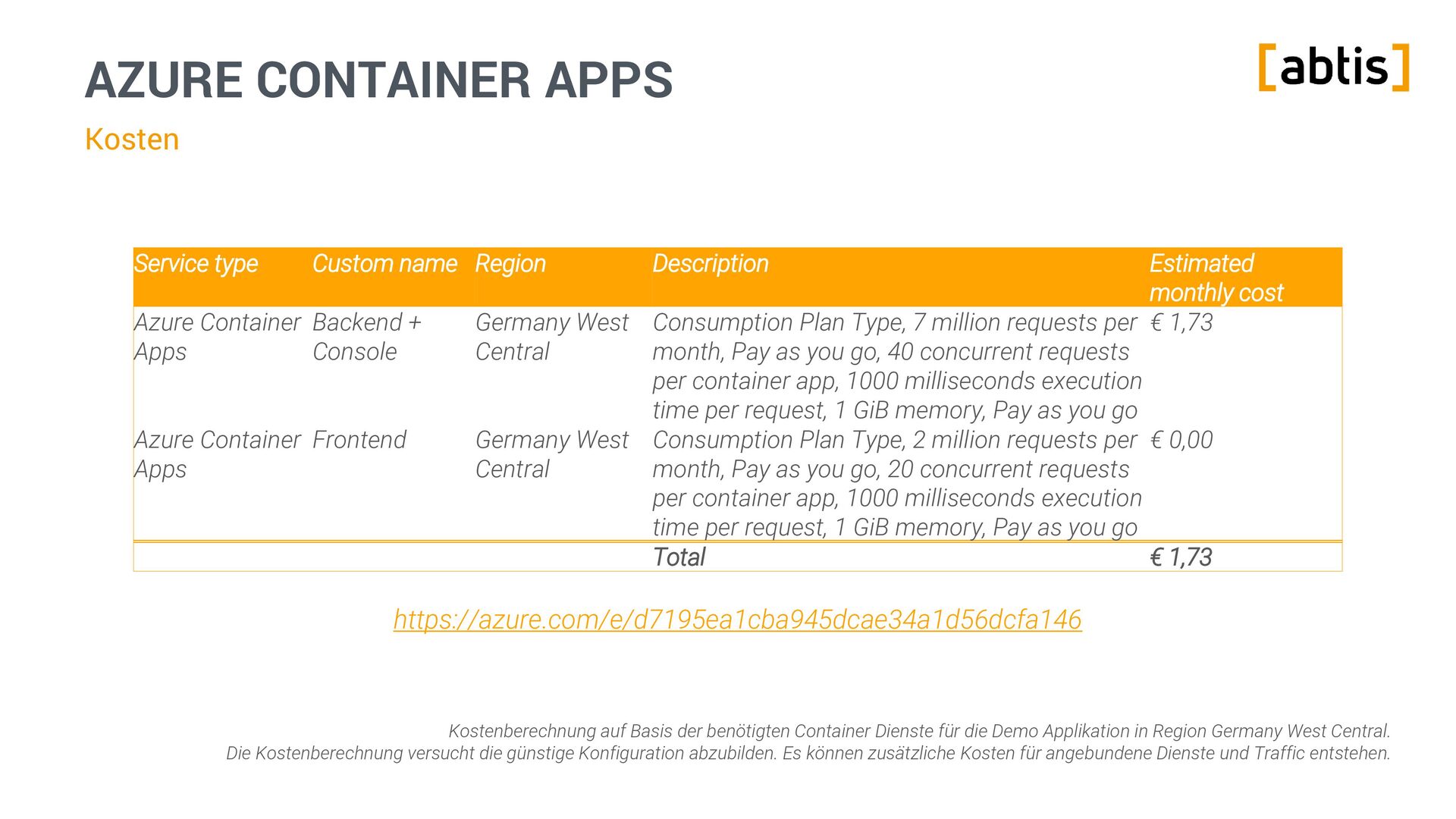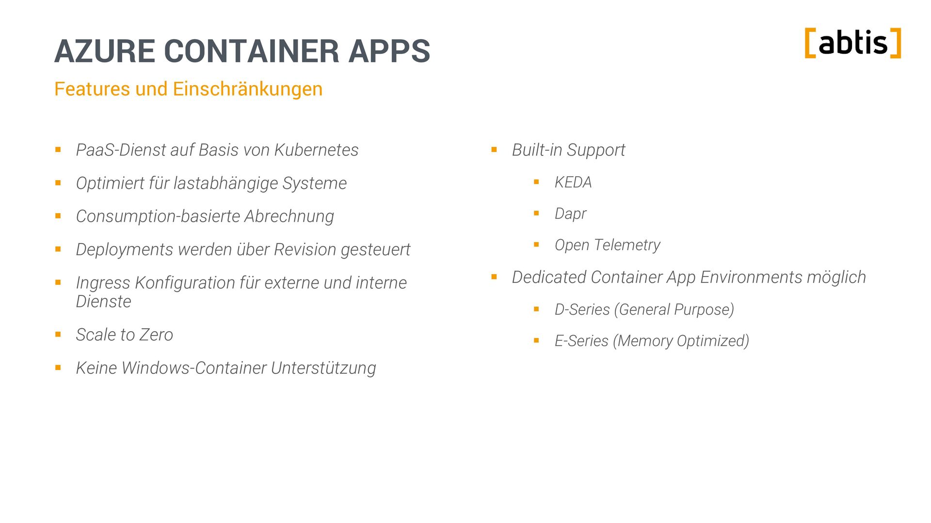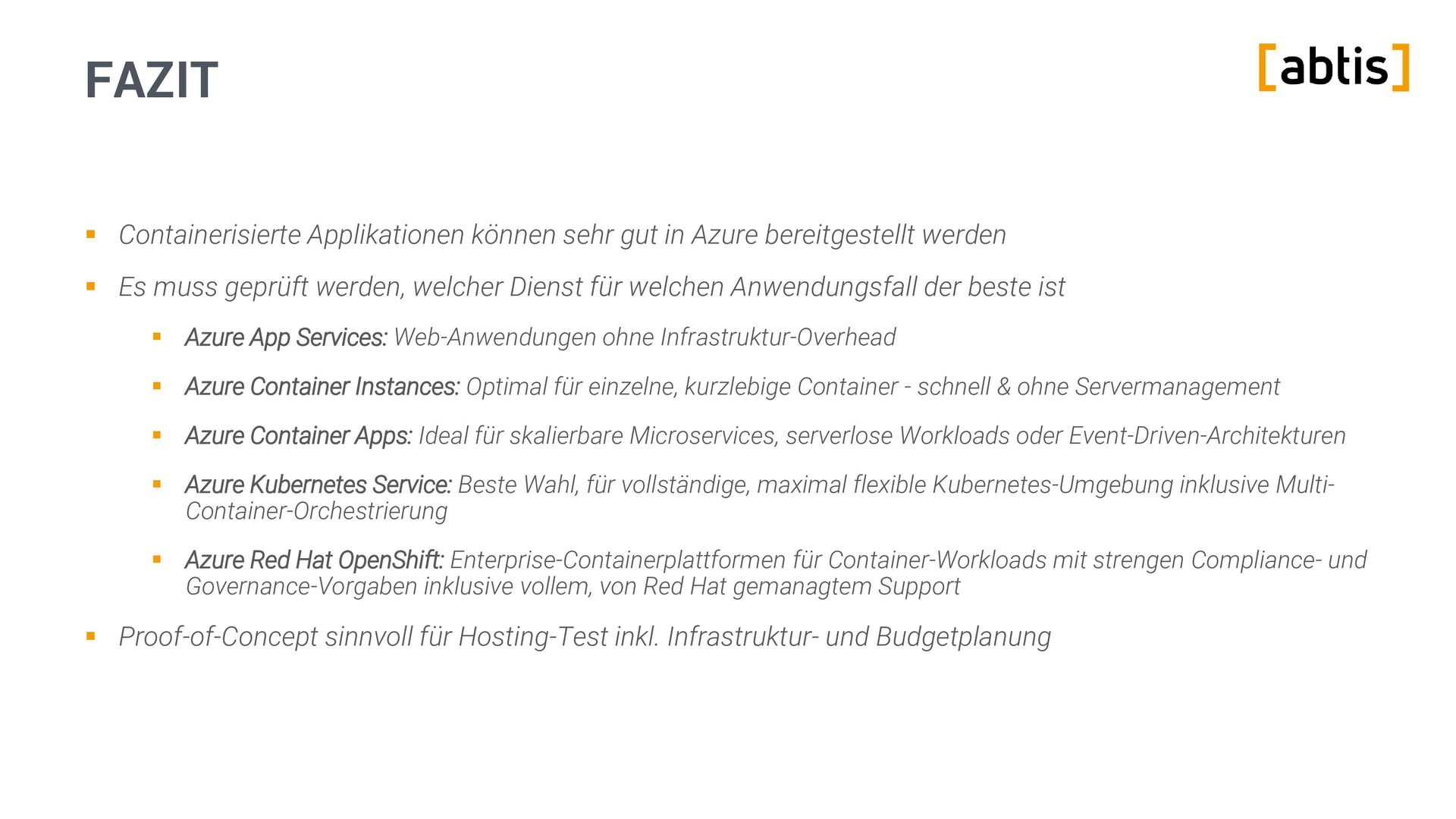 Neben den Voraussetzungen für die Nutzung der Dienste werden die Vor- und Nachteile der einzelnen Hosting-Optionen sowie ihre wichtigsten Features aufgezeigt. Dabei wird verdeutlicht, dass Azure Kubernetes Services nicht immer die einzige Lösung für skalierbare, containerbasierte Anwendungen sein muss.