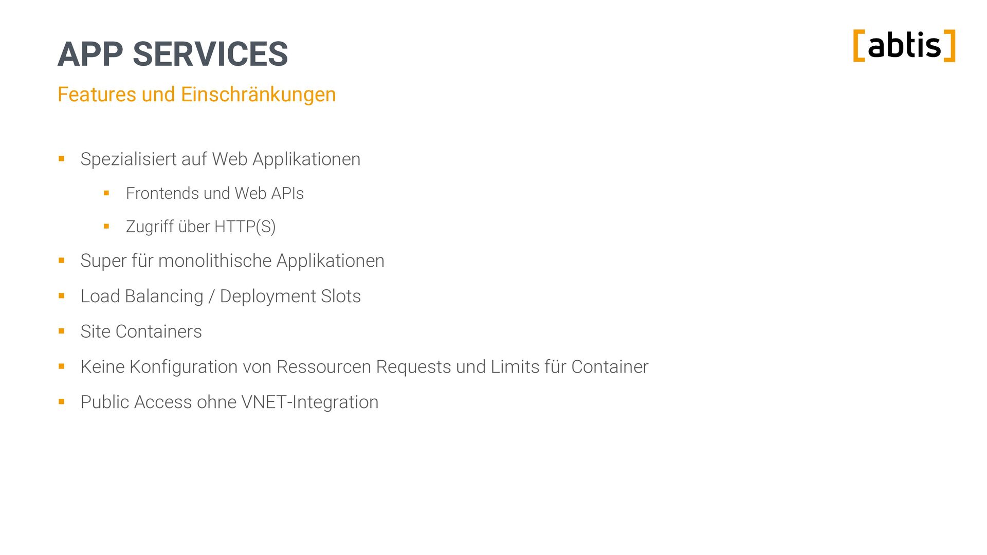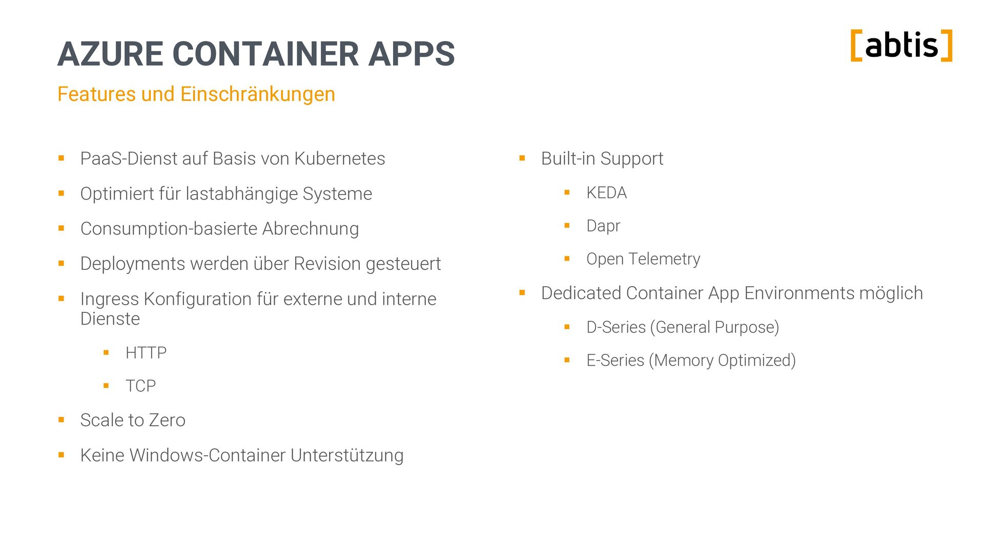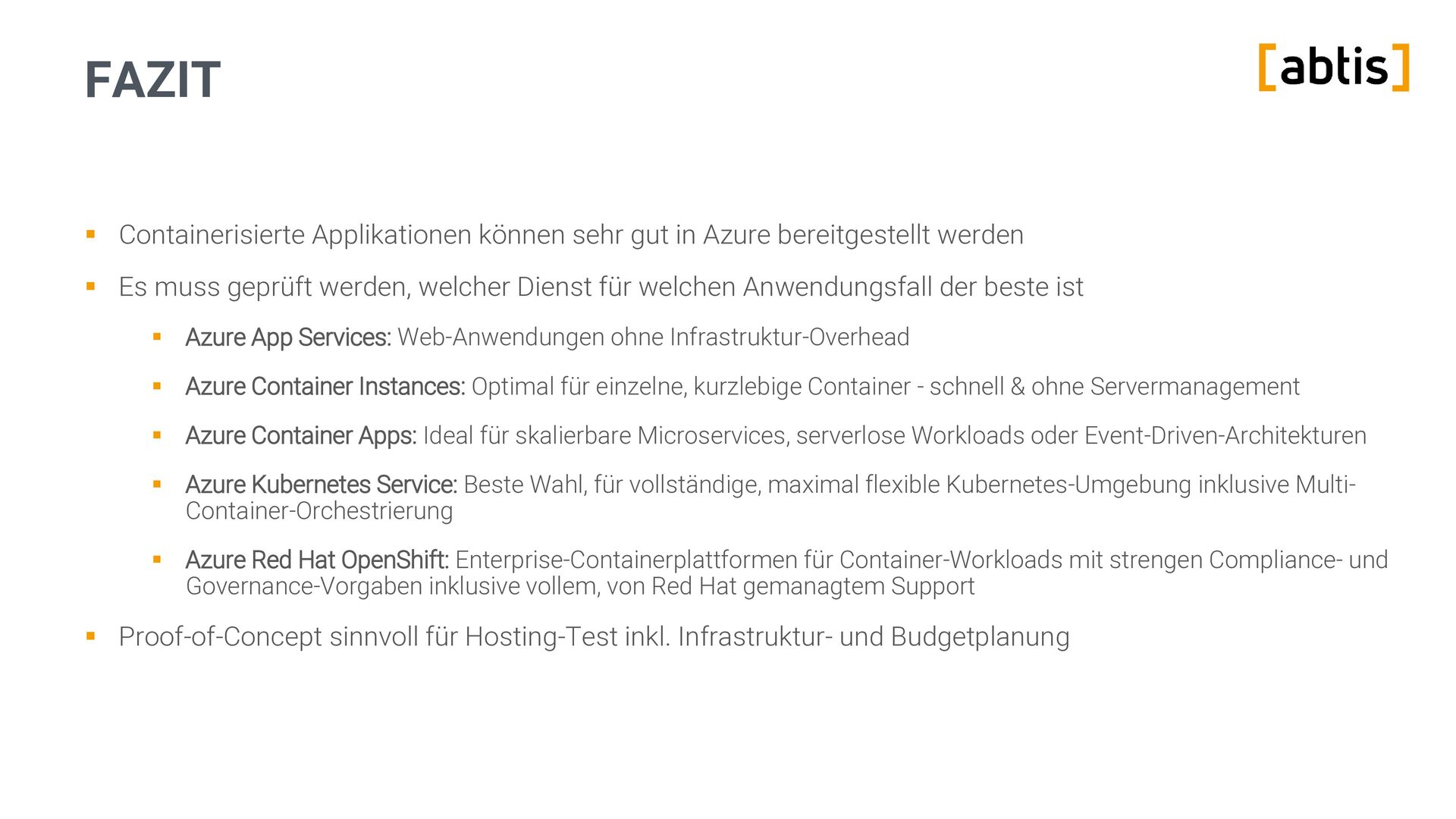 Neben den Voraussetzungen für die Nutzung der Dienste werden die Vor- und Nachteile der einzelnen Hosting-Optionen sowie ihre wichtigsten Features aufgezeigt. Dabei wird verdeutlicht, dass Azure Kubernetes Services nicht immer die einzige Lösung für skalierbare, containerbasierte Anwendungen sein muss.