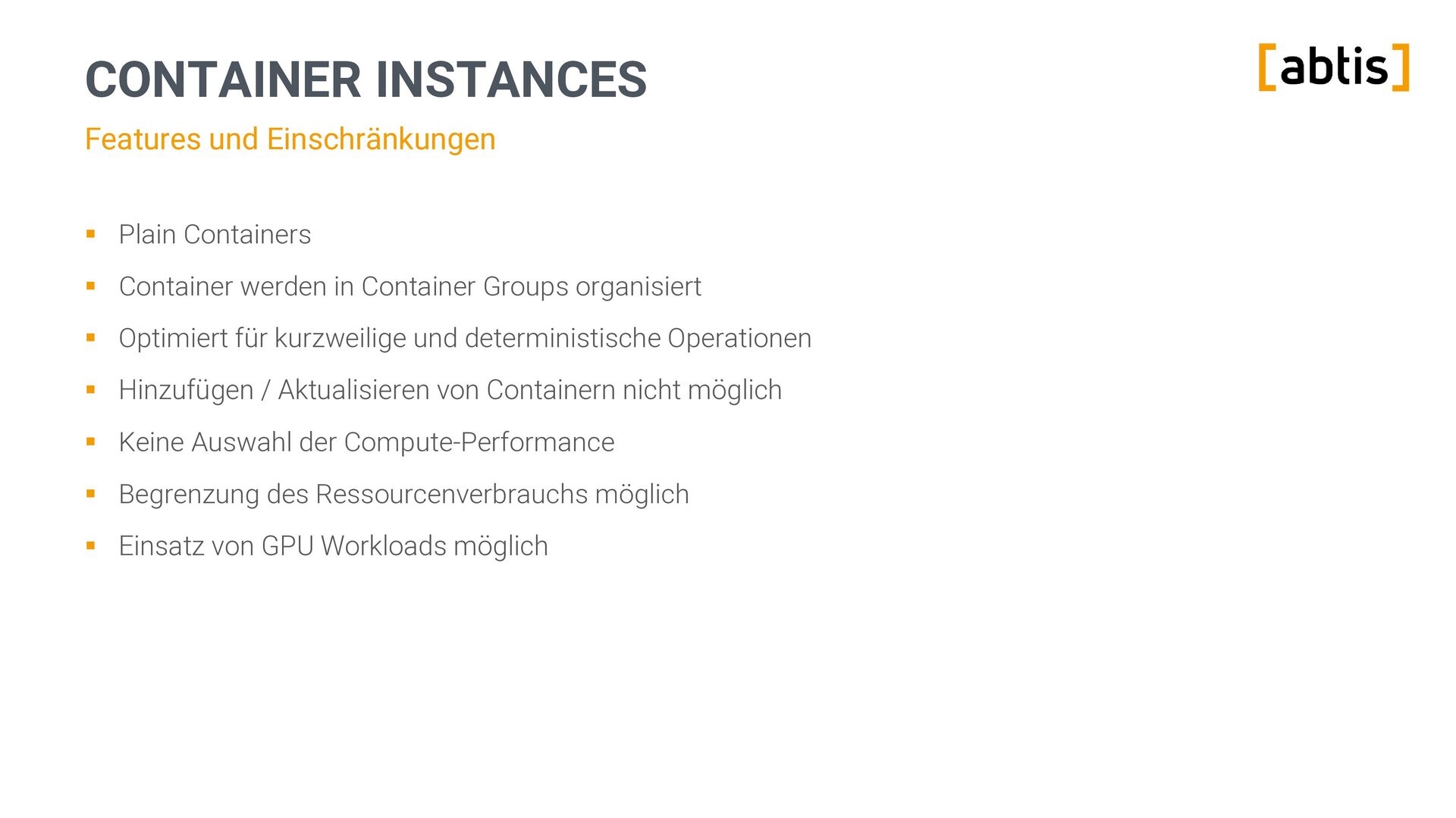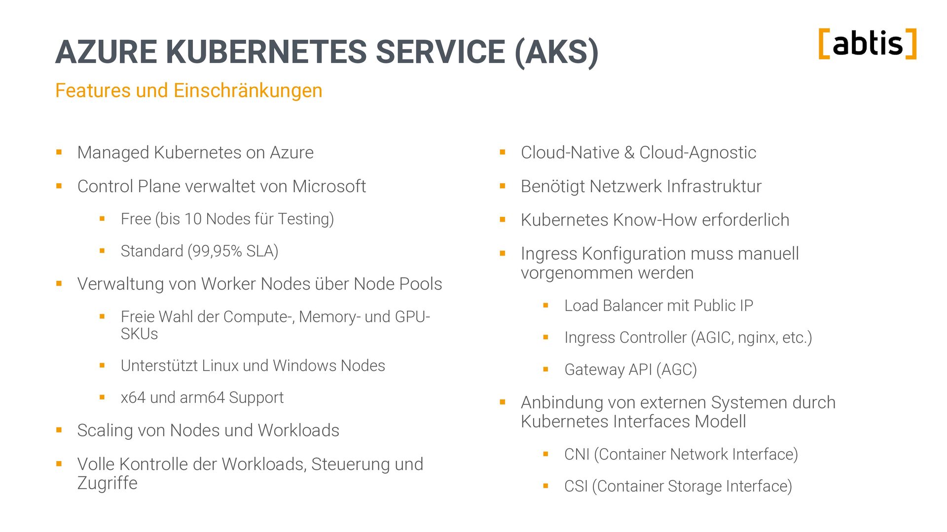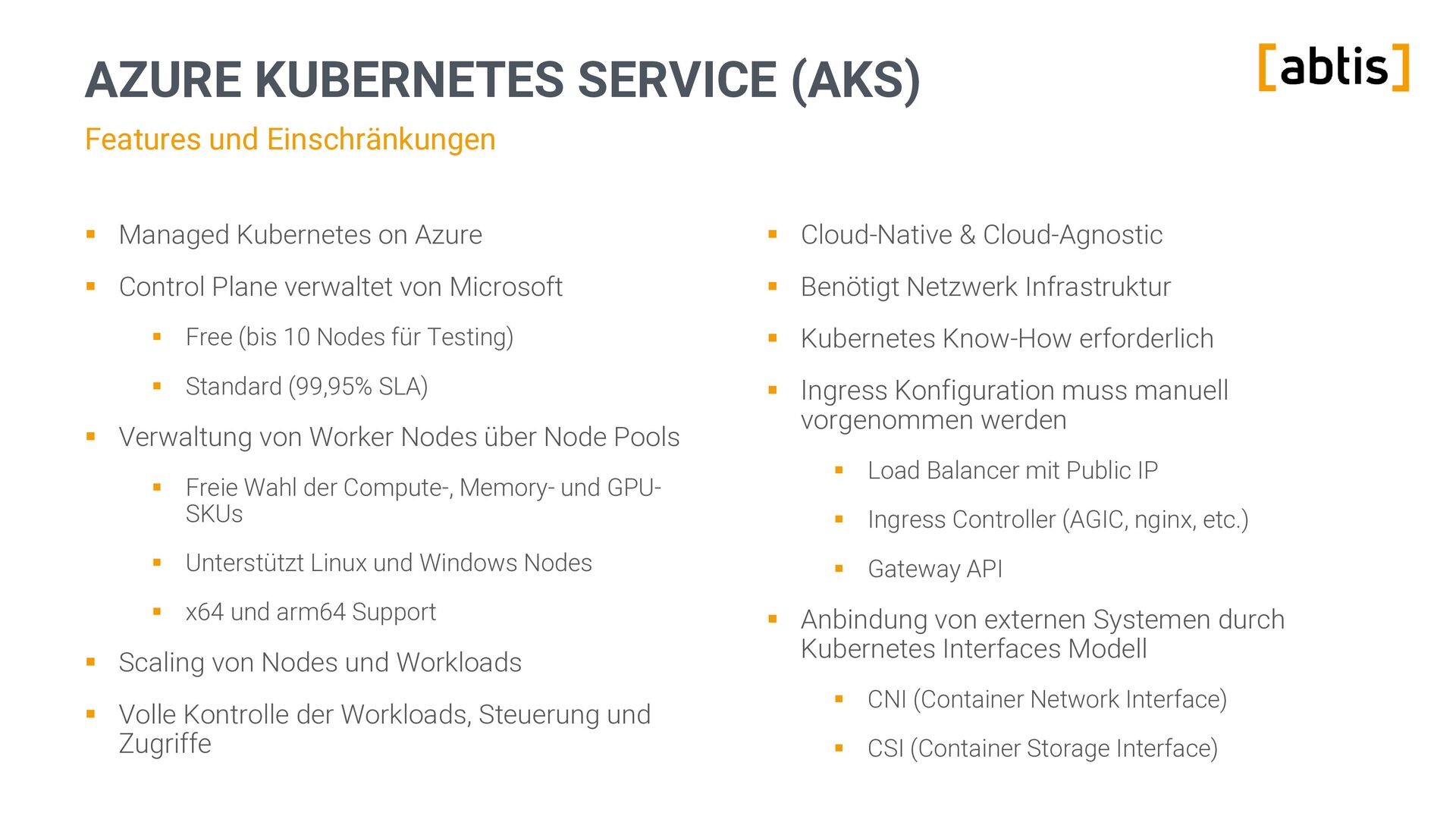 Neben den Voraussetzungen für die Nutzung der Dienste werden die Vor- und Nachteile der einzelnen Hosting-Optionen sowie ihre wichtigsten Features aufgezeigt. Dabei wird verdeutlicht, dass Azure Kubernetes Services nicht immer die einzige Lösung für skalierbare, containerbasierte Anwendungen sein muss.