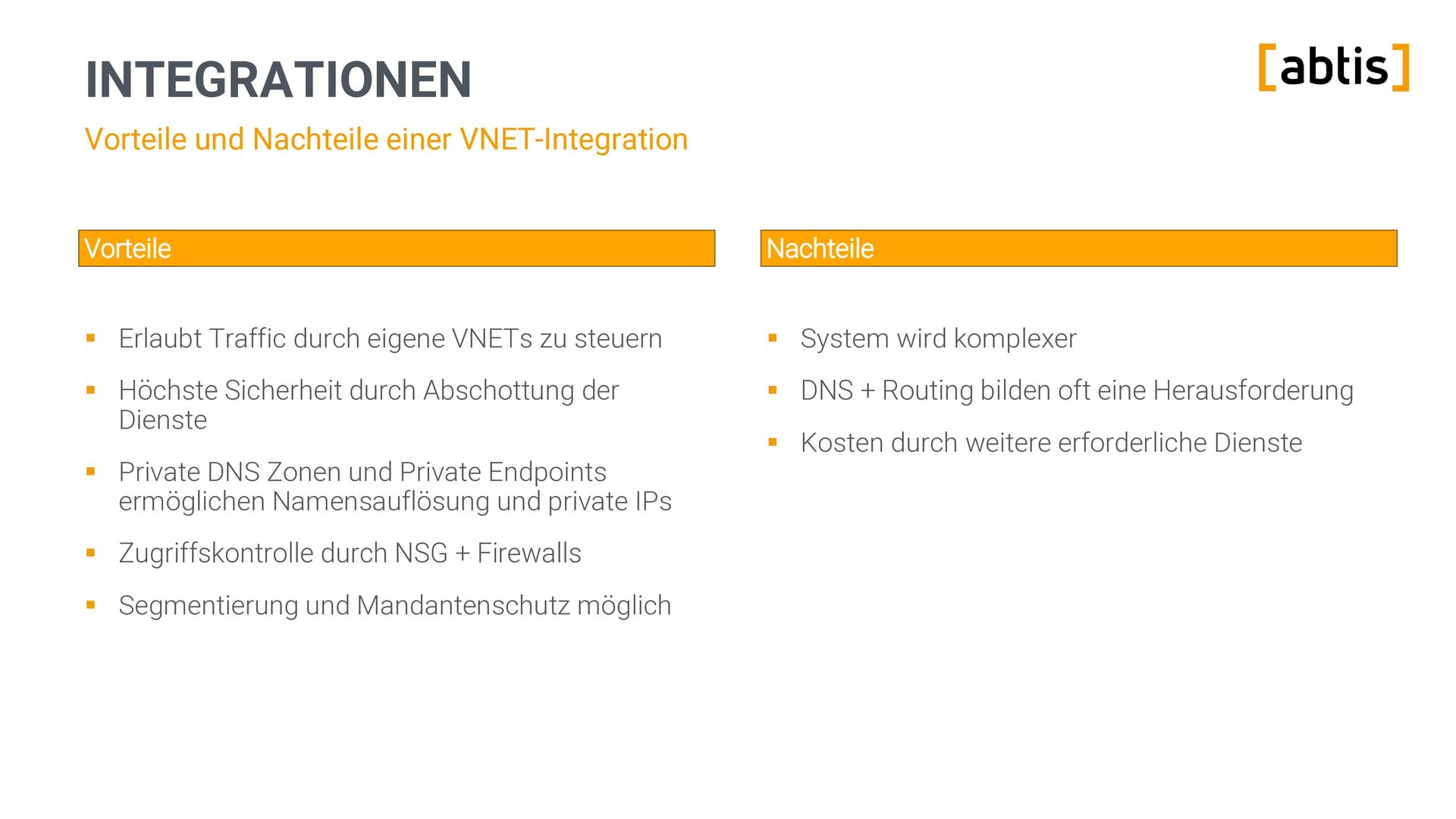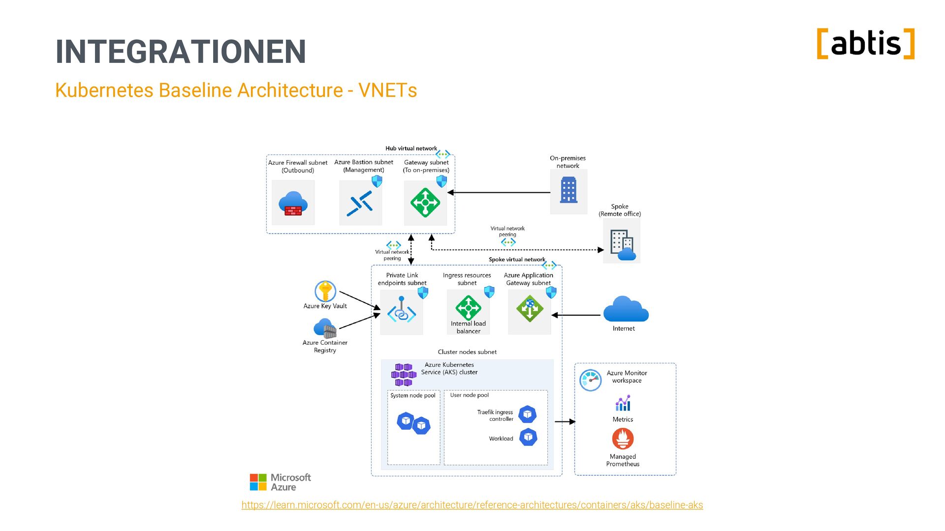 Ein weiterer wichtiger Aspekt ist die Integration der Container-Anwendungen mit anderen Azure-Diensten wie Virtual Networks (VNETs) und Sicherheitslösungen wie Azure Defender for Containers. Diese Integrationsmöglichkeiten ermöglichen eine erweiterte Skalierbarkeit, Sicherheit und Verwaltung von Container-Umgebungen.