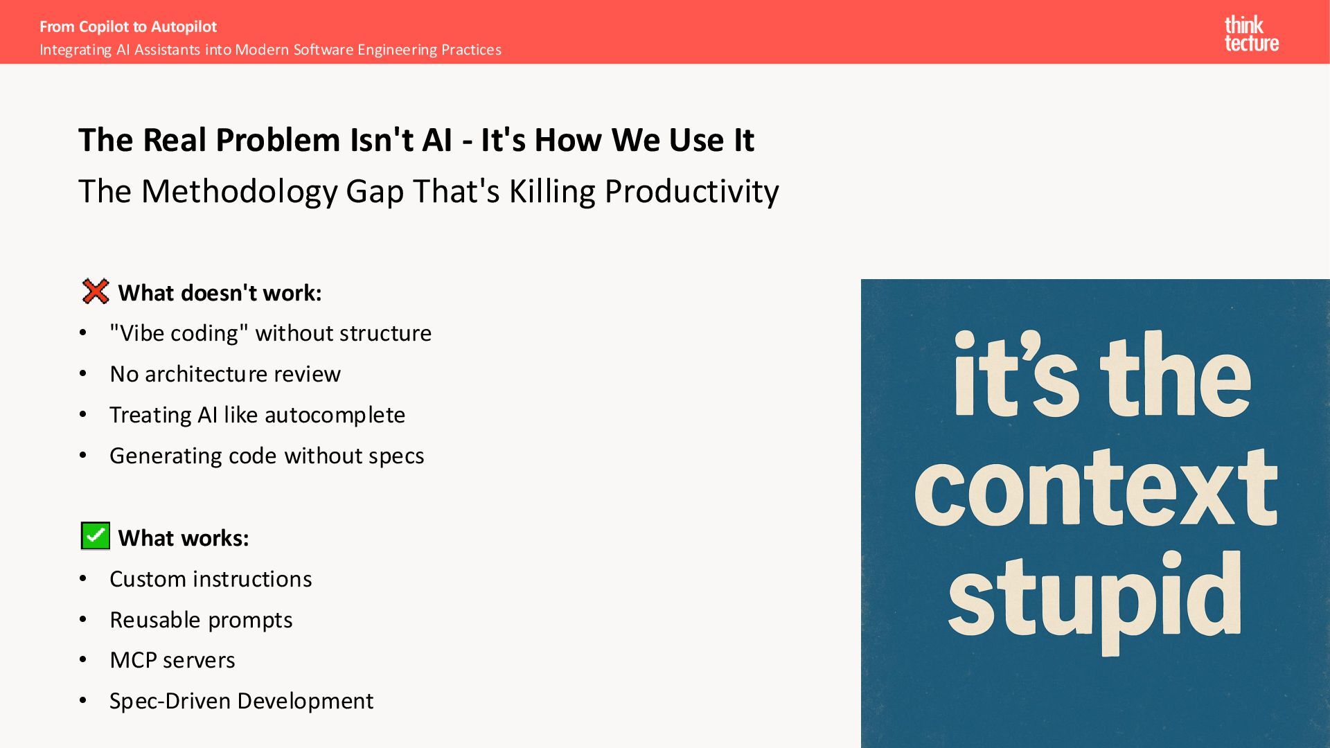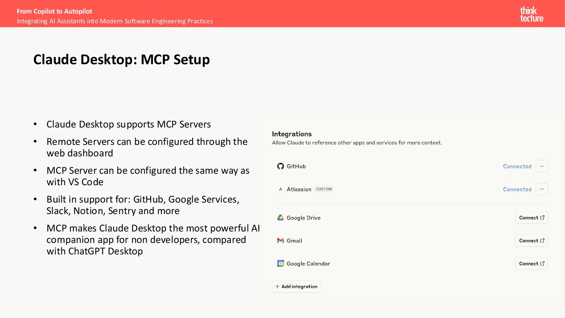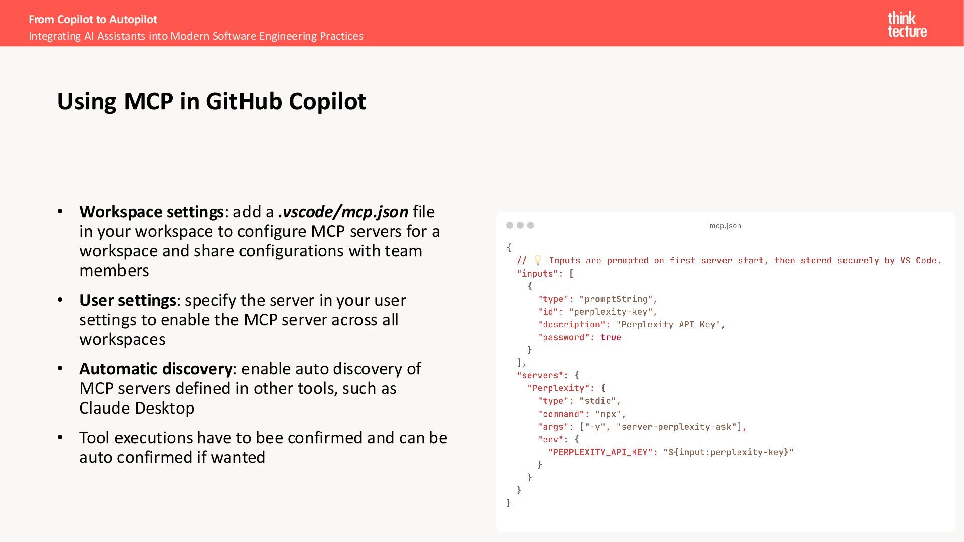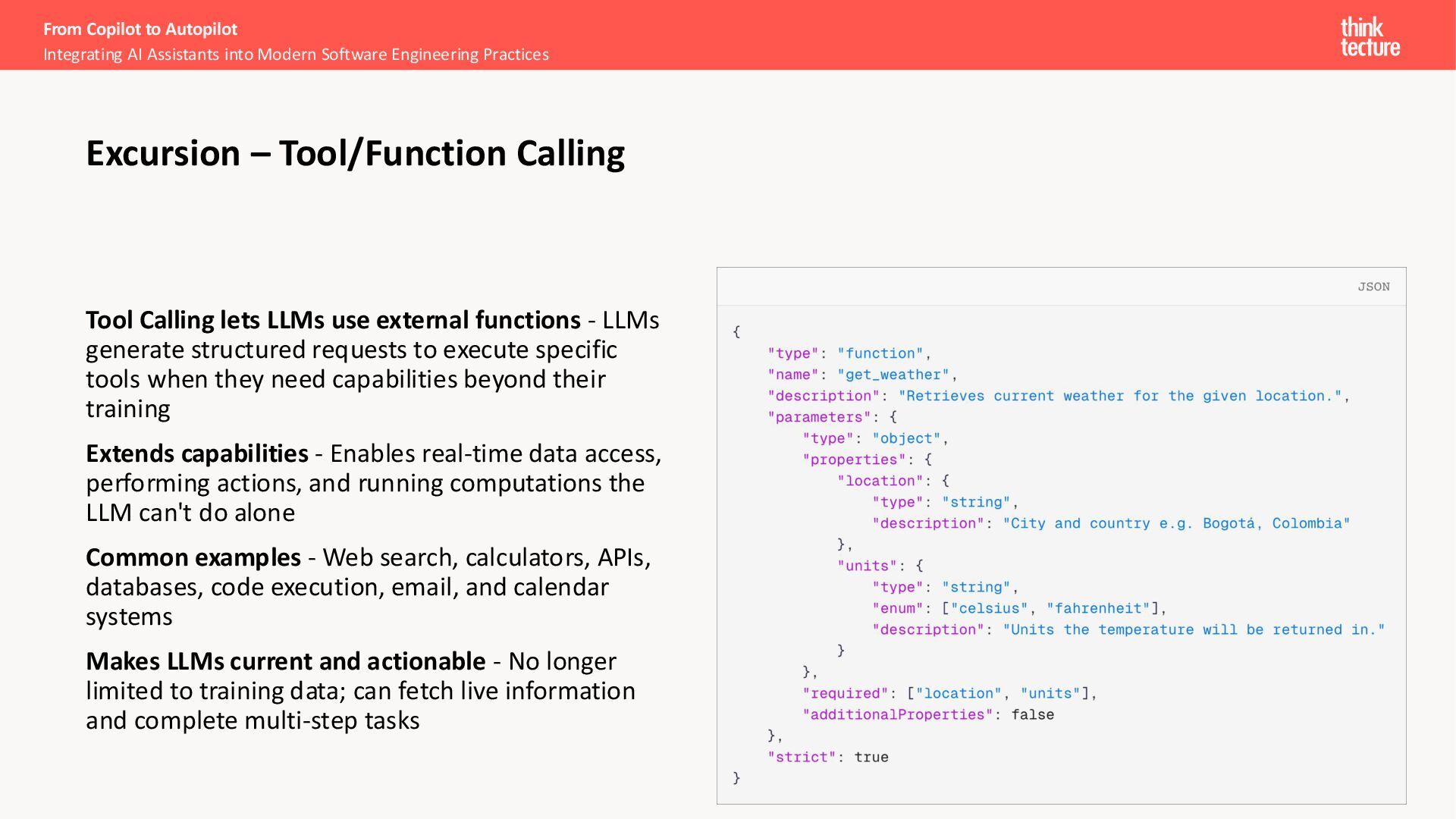 structured requests to execute specific tools when they need capabilities beyond their training Extends capabilities - Enables real-time data access, performing actions, and running computations the LLM can't do alone Common examples - Web search, calculators, APIs, databases, code execution, email, and calendar systems Makes LLMs current and actionable - No longer limited to training data; can fetch live information and complete multi-step tasks Excursion – Tool/Function Calling From Copilot to Autopilot Integrating AI Assistants into Modern Software Engineering Practices