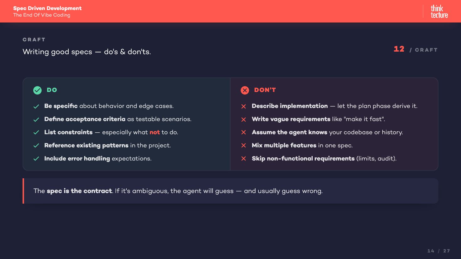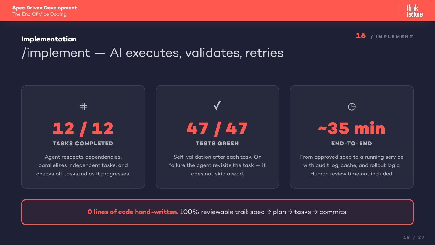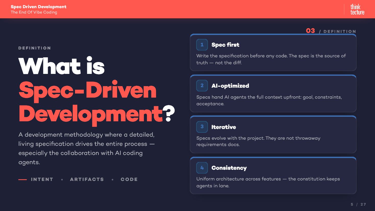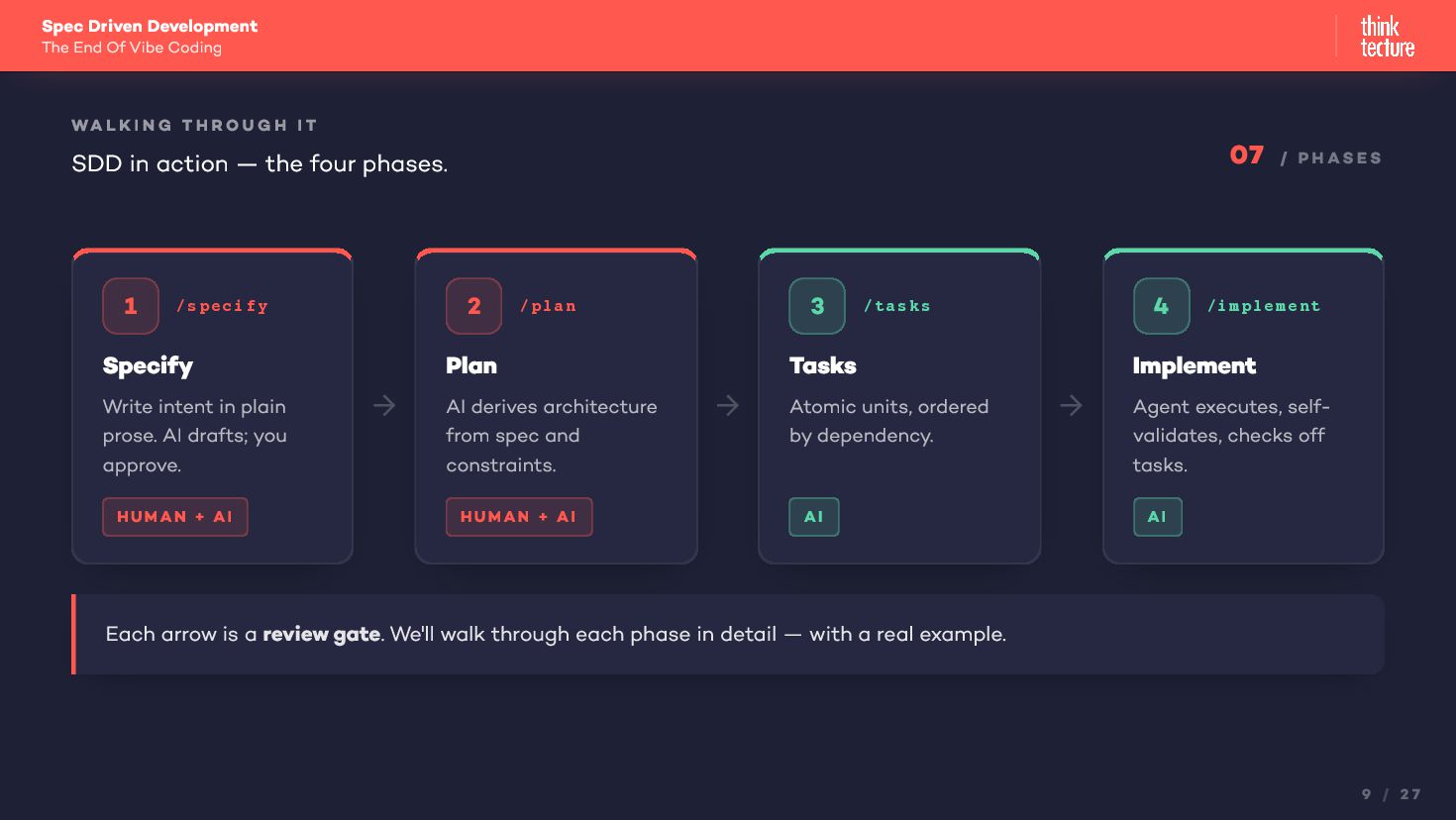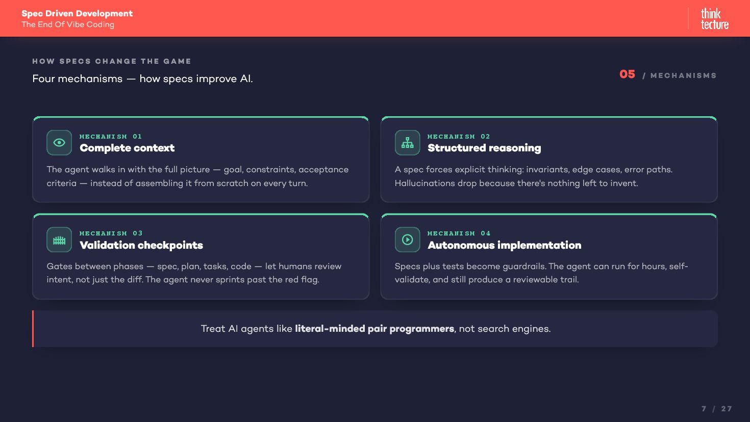 HOW SPECS CHANGE THE GAME Four mechanisms — how specs improve AI. 05 / MECHANISMS MECHANISM 01 Complete context The agent walks in with the full picture — goal, constraints, acceptance criteria — instead of assembling it from scratch on every turn. MECHANISM 02 Structured reasoning A spec forces explicit thinking: invariants, edge cases, error paths. Hallucinations drop because there's nothing left to invent. MECHANISM 03 Validation checkpoints Gates between phases — spec, plan, tasks, code — let humans review intent, not just the diff. The agent never sprints past the red flag. MECHANISM 04 Autonomous implementation Specs plus tests become guardrails. The agent can run for hours, self- validate, and still produce a reviewable trail. Spec Driven Development The End Of Vibe Coding 7 / 27