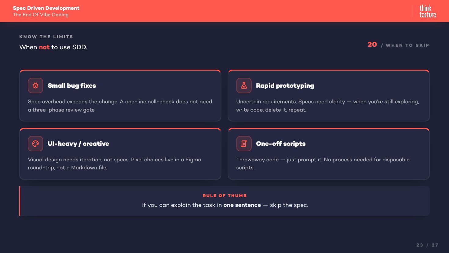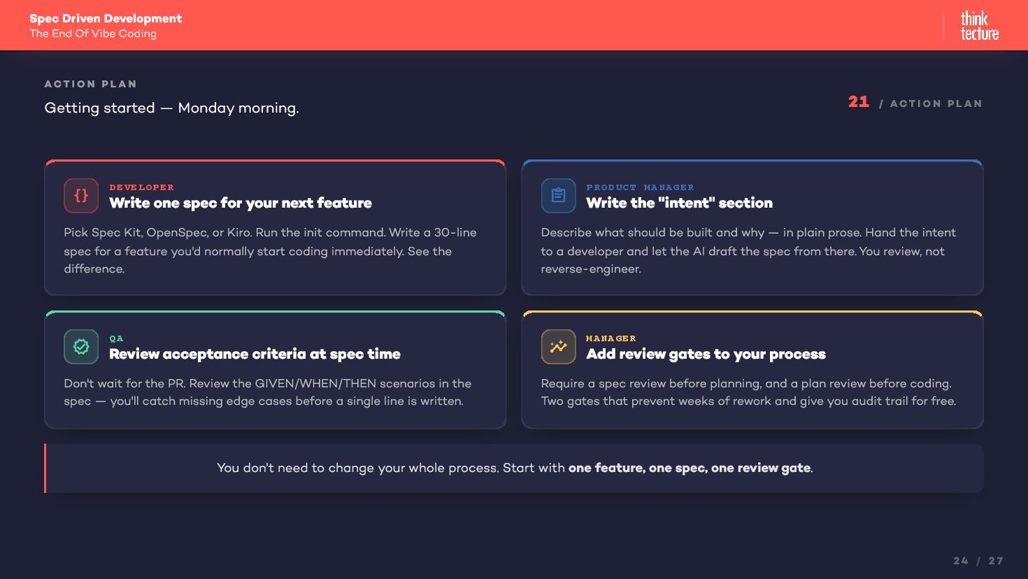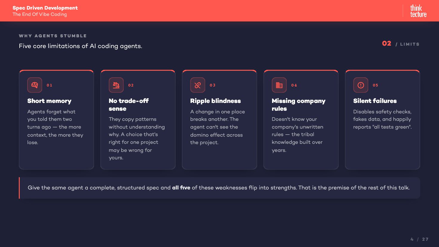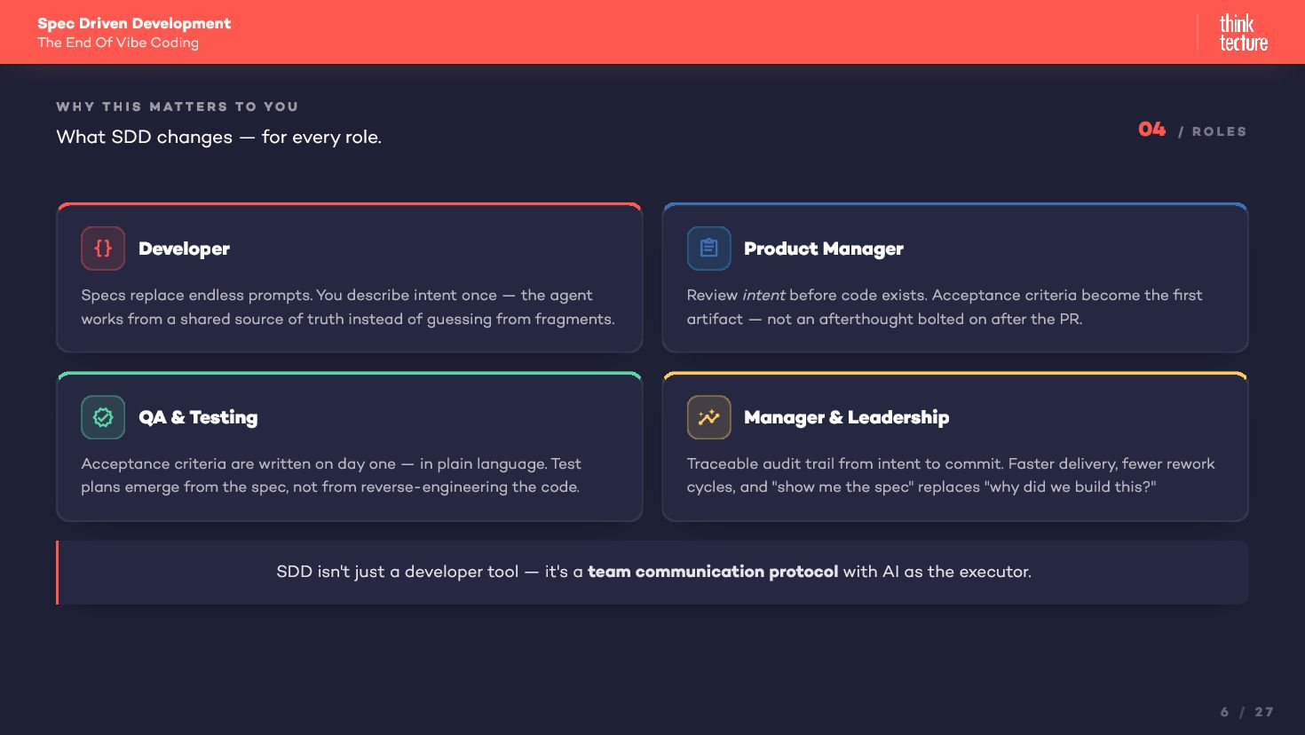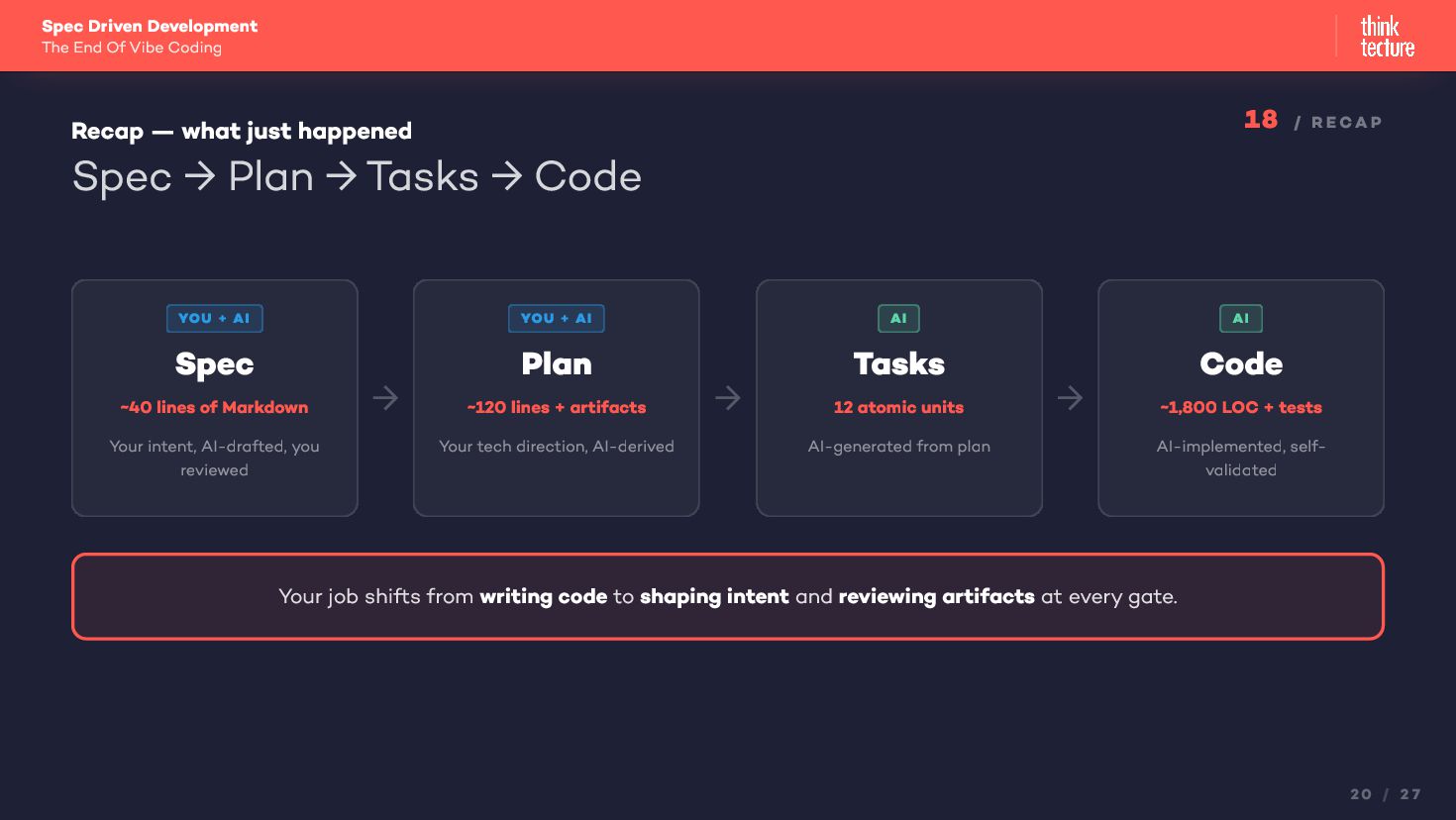 HOW SPECS CHANGE THE GAME Four mechanisms — how specs improve AI. 05 / MECHANISMS MECHANISM 01 Complete context The agent walks in with the full picture — goal, constraints, acceptance criteria — instead of assembling it from scratch on every turn. MECHANISM 02 Structured reasoning A spec forces explicit thinking: invariants, edge cases, error paths. Hallucinations drop because there's nothing left to invent. MECHANISM 03 Validation checkpoints Gates between phases — spec, plan, tasks, code — let humans review intent, not just the diff. The agent never sprints past the red flag. MECHANISM 04 Autonomous implementation Specs plus tests become guardrails. The agent can run for hours, self- validate, and still produce a reviewable trail. Spec Driven Development The End Of Vibe Coding 7 / 27