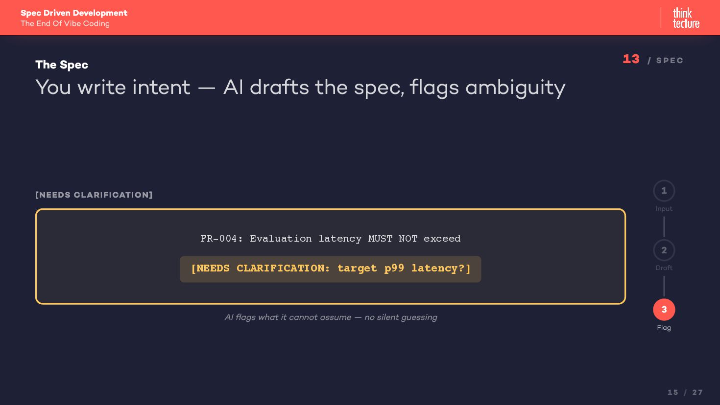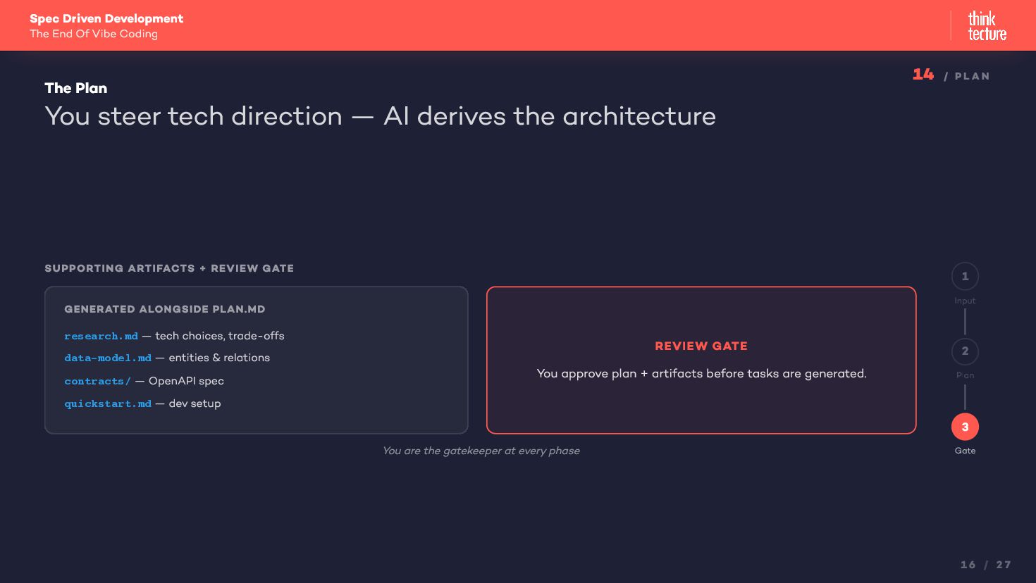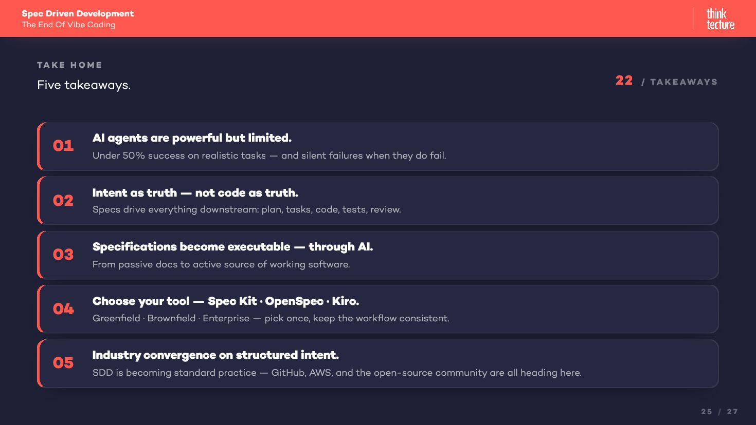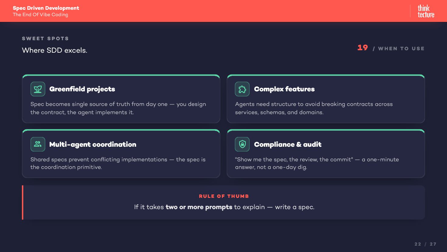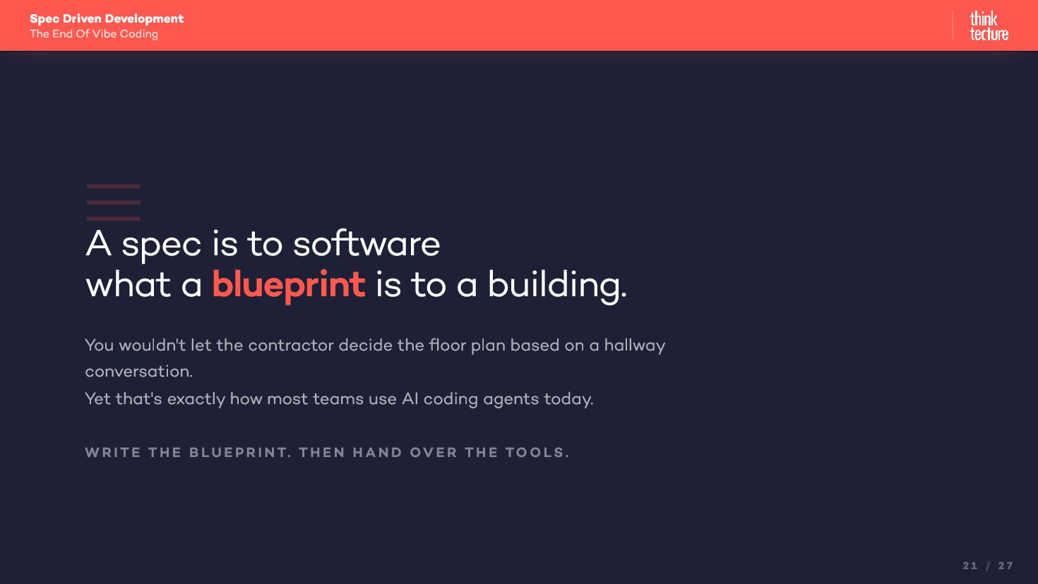 HOW SPECS CHANGE THE GAME Four mechanisms — how specs improve AI. 05 / MECHANISMS MECHANISM 01 Complete context The agent walks in with the full picture — goal, constraints, acceptance criteria — instead of assembling it from scratch on every turn. MECHANISM 02 Structured reasoning A spec forces explicit thinking: invariants, edge cases, error paths. Hallucinations drop because there's nothing left to invent. MECHANISM 03 Validation checkpoints Gates between phases — spec, plan, tasks, code — let humans review intent, not just the diff. The agent never sprints past the red flag. MECHANISM 04 Autonomous implementation Specs plus tests become guardrails. The agent can run for hours, self- validate, and still produce a reviewable trail. Spec Driven Development The End Of Vibe Coding 7 / 27
