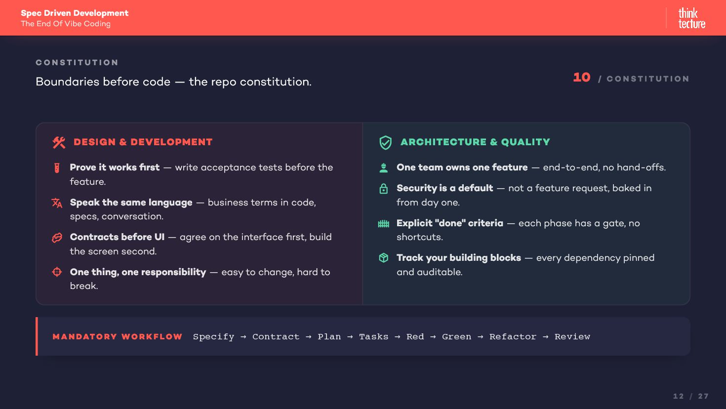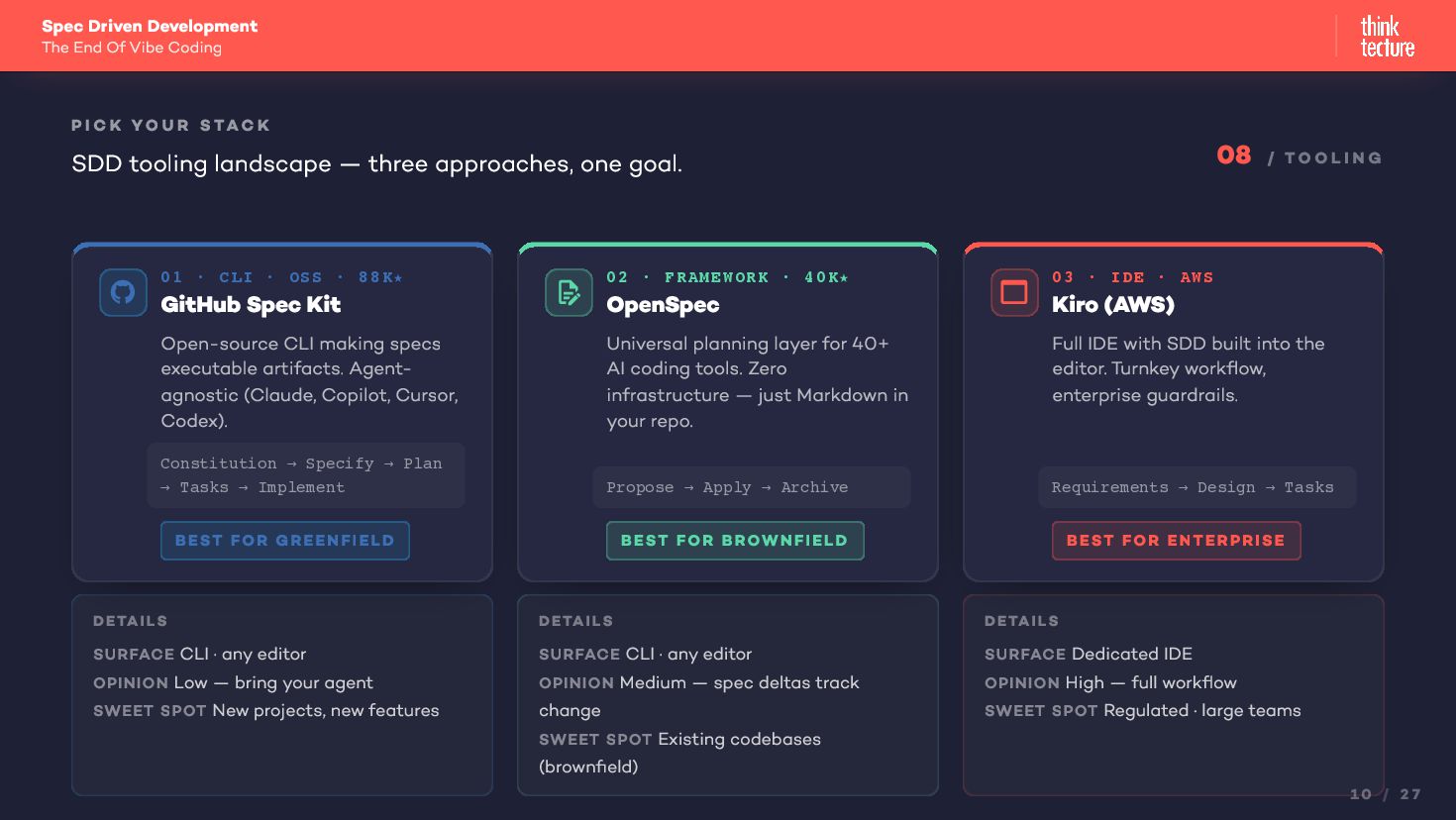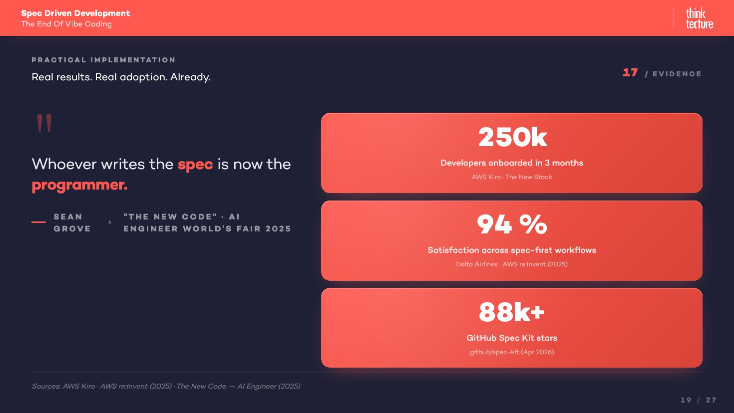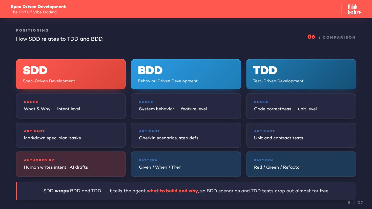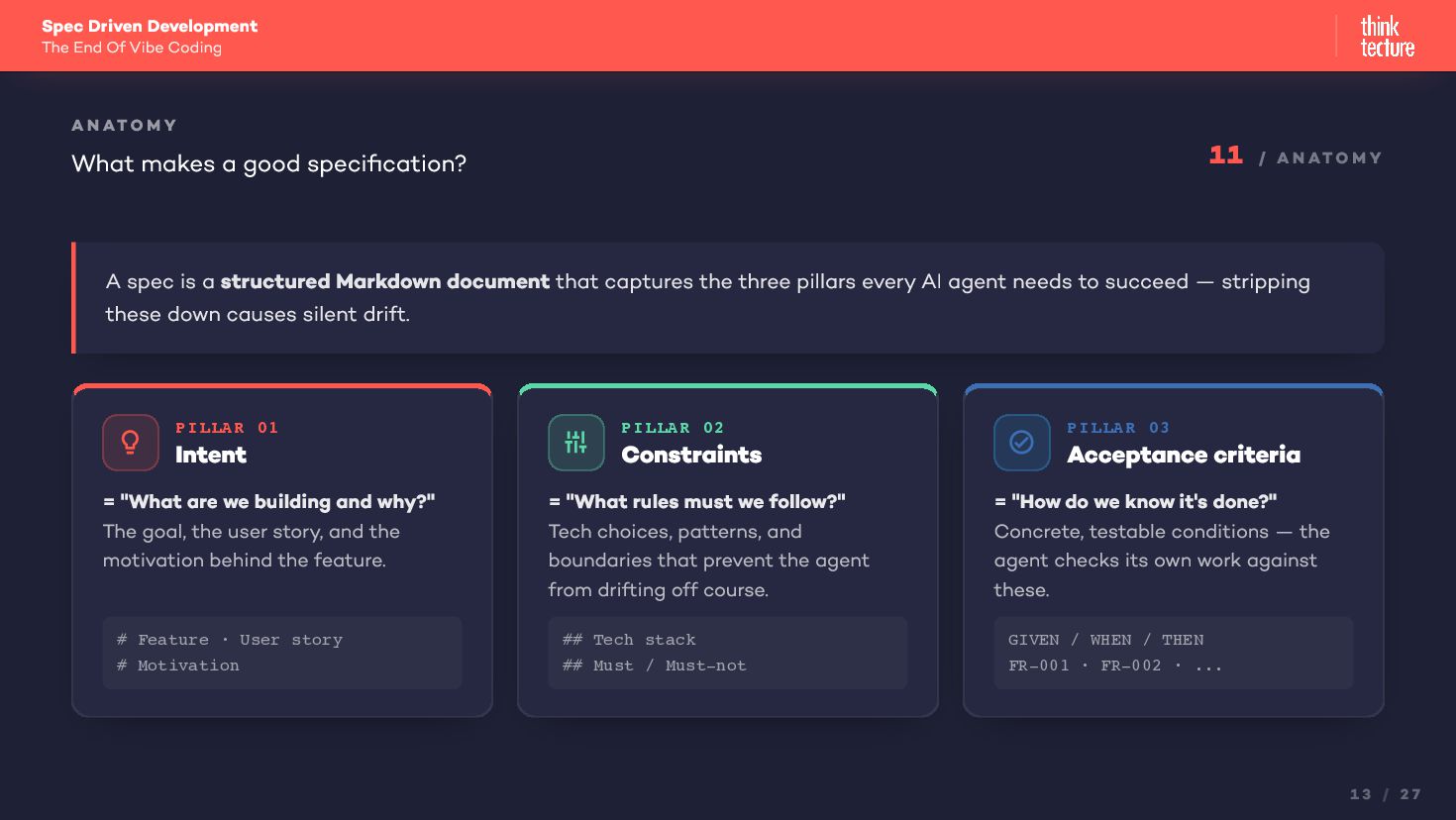 HOW SPECS CHANGE THE GAME Four mechanisms — how specs improve AI. 05 / MECHANISMS MECHANISM 01 Complete context The agent walks in with the full picture — goal, constraints, acceptance criteria — instead of assembling it from scratch on every turn. MECHANISM 02 Structured reasoning A spec forces explicit thinking: invariants, edge cases, error paths. Hallucinations drop because there's nothing left to invent. MECHANISM 03 Validation checkpoints Gates between phases — spec, plan, tasks, code — let humans review intent, not just the diff. The agent never sprints past the red flag. MECHANISM 04 Autonomous implementation Specs plus tests become guardrails. The agent can run for hours, self- validate, and still produce a reviewable trail. Spec Driven Development The End Of Vibe Coding 7 / 27