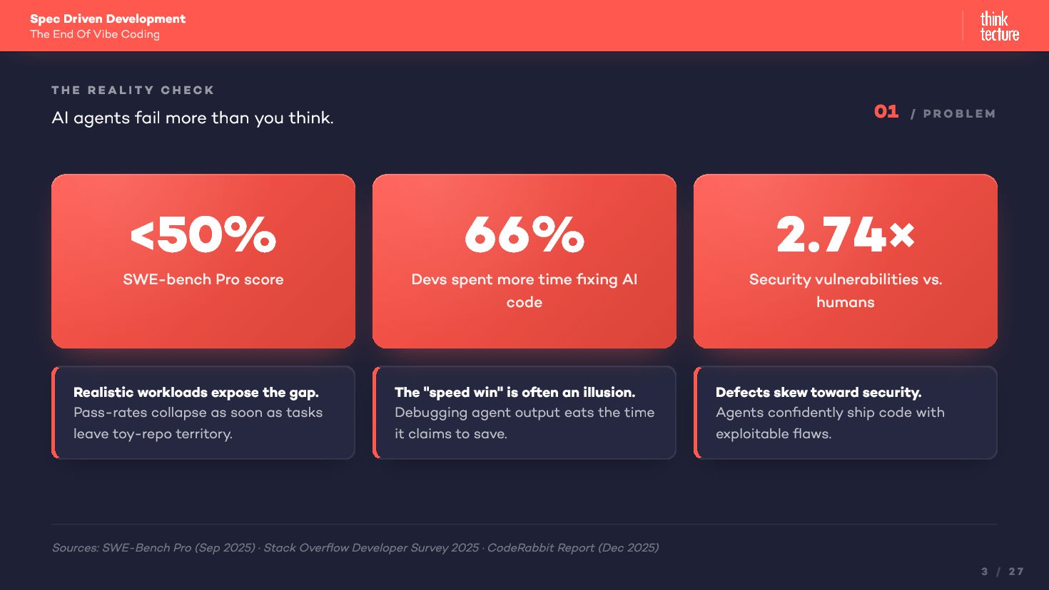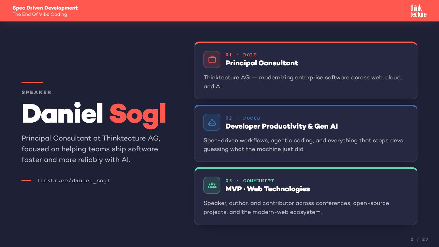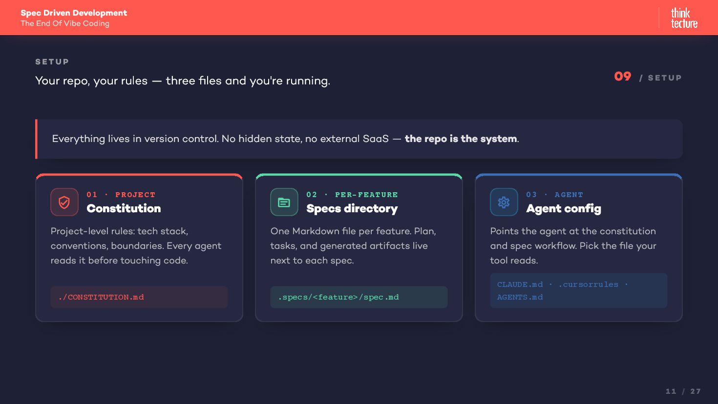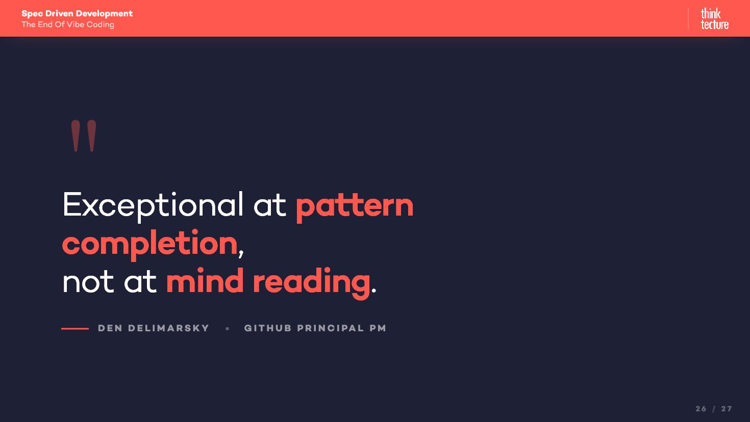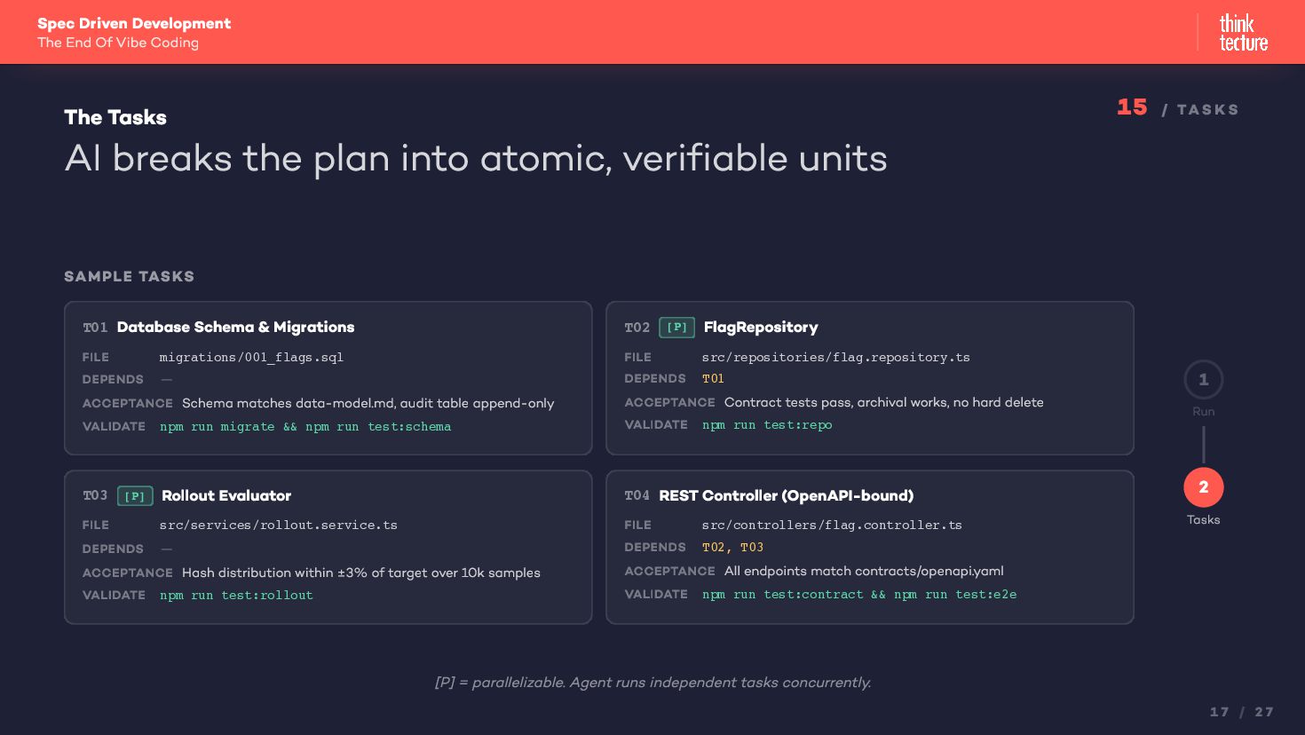 HOW SPECS CHANGE THE GAME Four mechanisms — how specs improve AI. 05 / MECHANISMS MECHANISM 01 Complete context The agent walks in with the full picture — goal, constraints, acceptance criteria — instead of assembling it from scratch on every turn. MECHANISM 02 Structured reasoning A spec forces explicit thinking: invariants, edge cases, error paths. Hallucinations drop because there's nothing left to invent. MECHANISM 03 Validation checkpoints Gates between phases — spec, plan, tasks, code — let humans review intent, not just the diff. The agent never sprints past the red flag. MECHANISM 04 Autonomous implementation Specs plus tests become guardrails. The agent can run for hours, self- validate, and still produce a reviewable trail. Spec Driven Development The End Of Vibe Coding 7 / 27