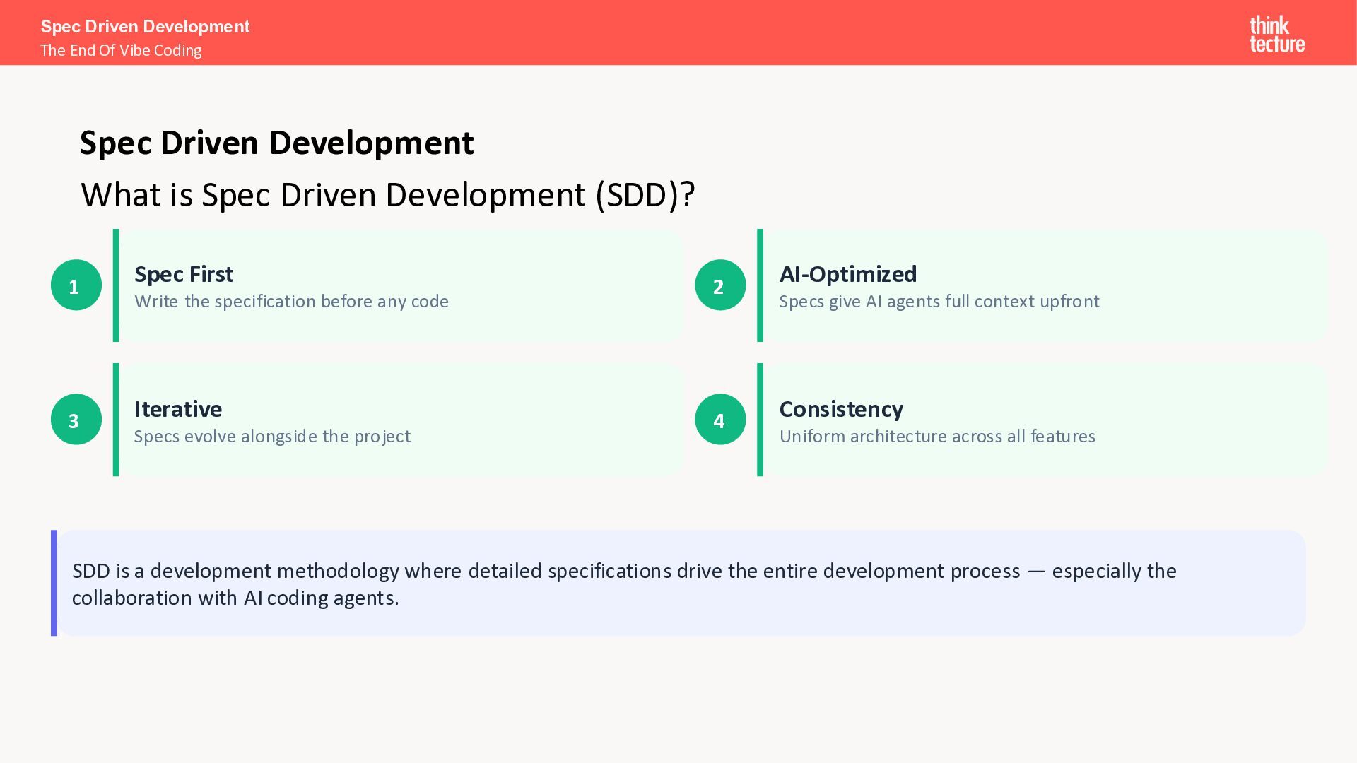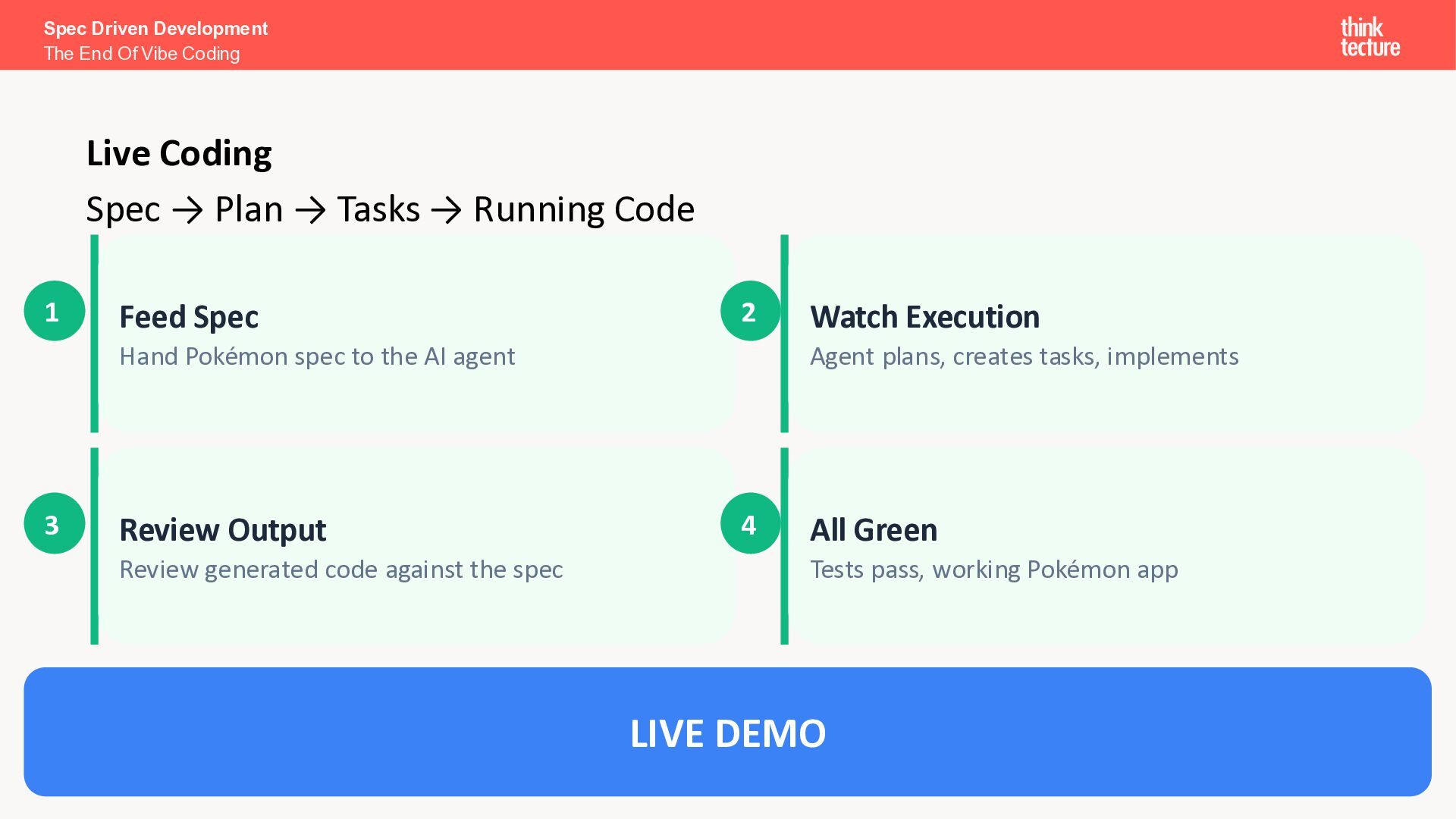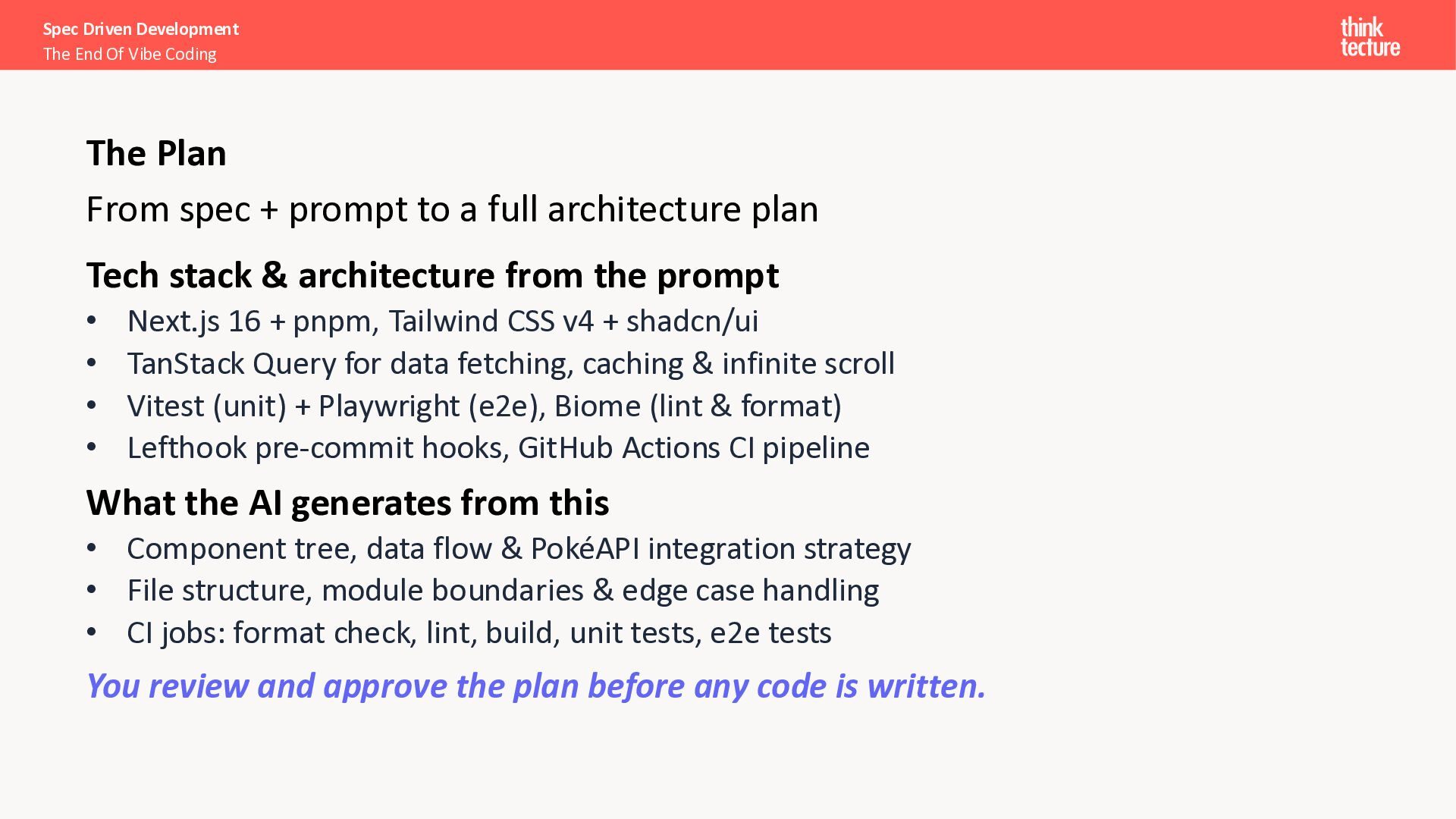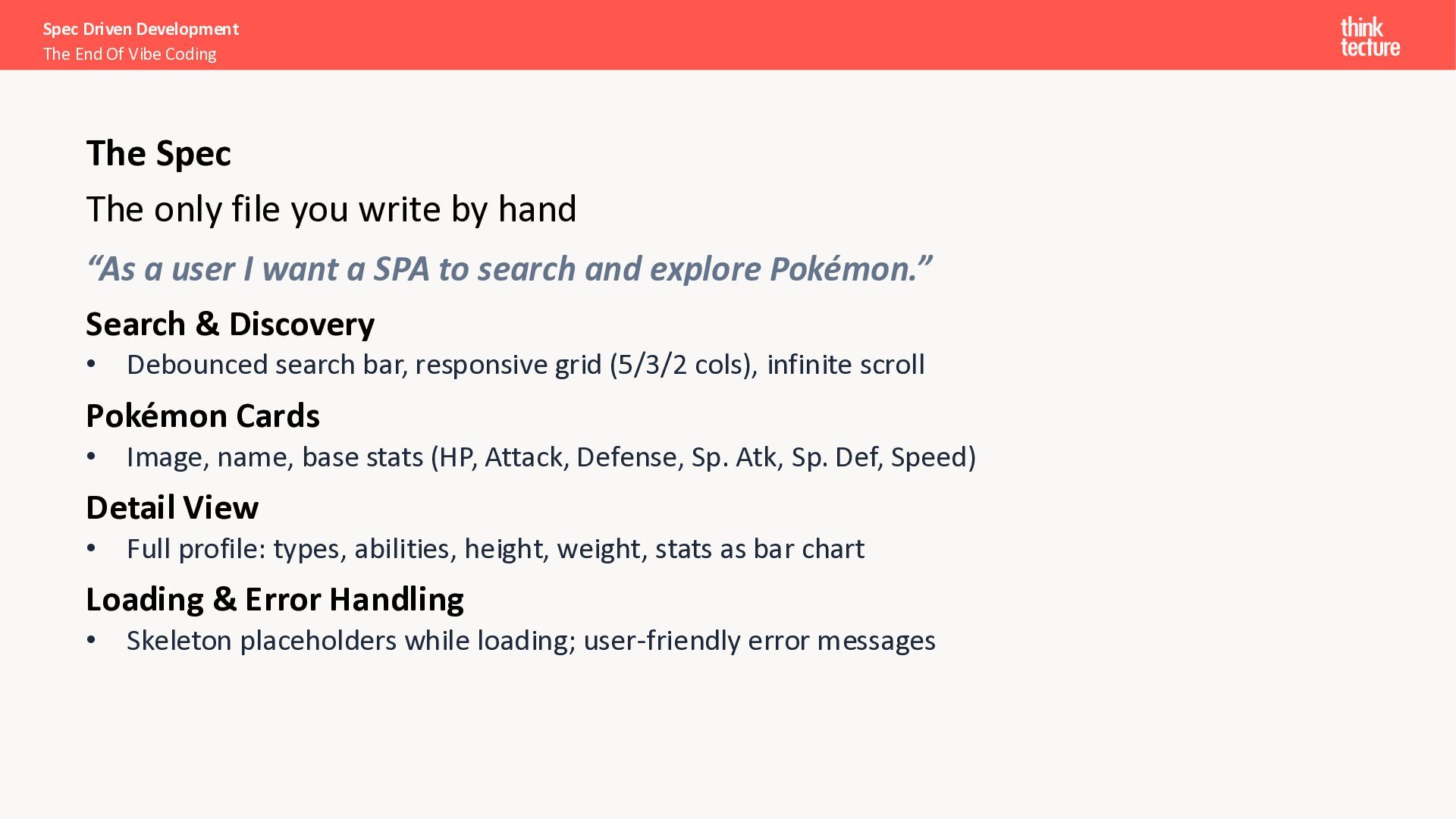 I want a SPA to search and explore Pokémon.” Search & Discovery • Debounced search bar, responsive grid (5/3/2 cols), infinite scroll Pokémon Cards • Image, name, base stats (HP, Attack, Defense, Sp. Atk, Sp. Def, Speed) Detail View • Full profile: types, abilities, height, weight, stats as bar chart Loading & Error Handling • Skeleton placeholders while loading; user-friendly error messages Spec Driven Development The End Of Vibe Coding The Spec