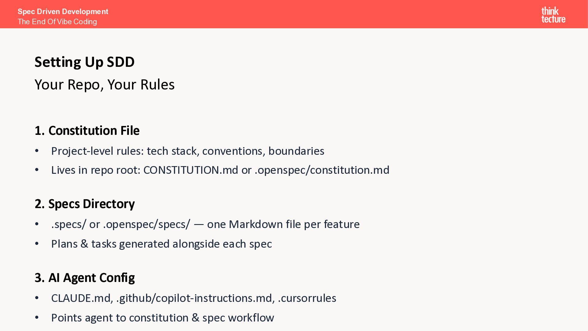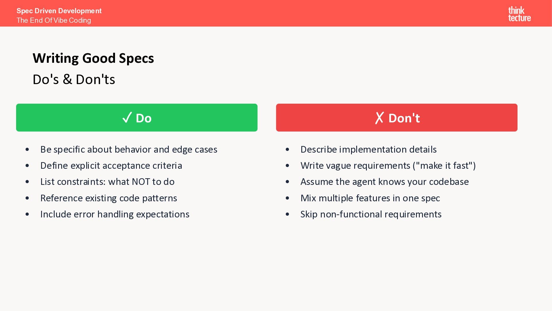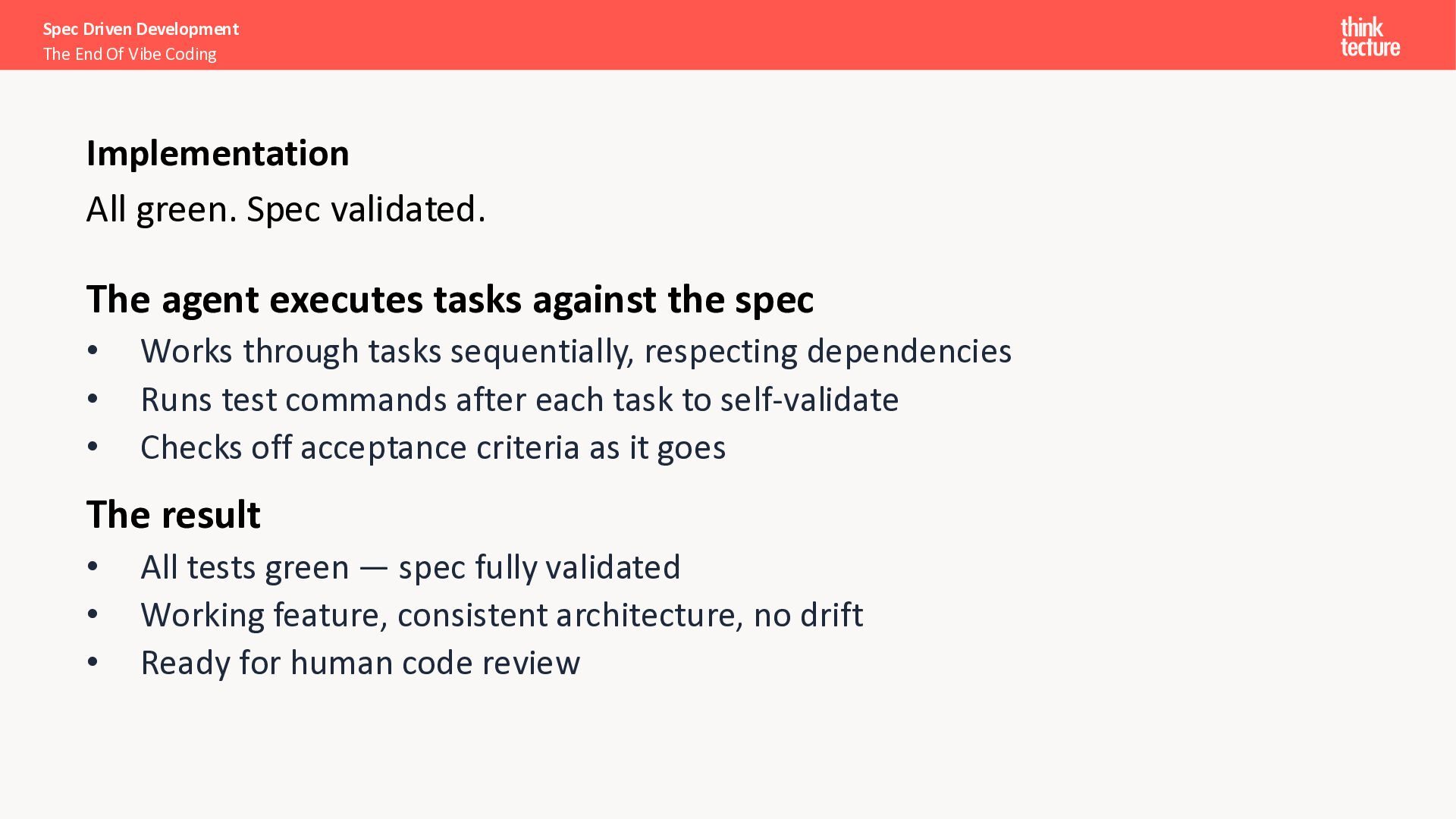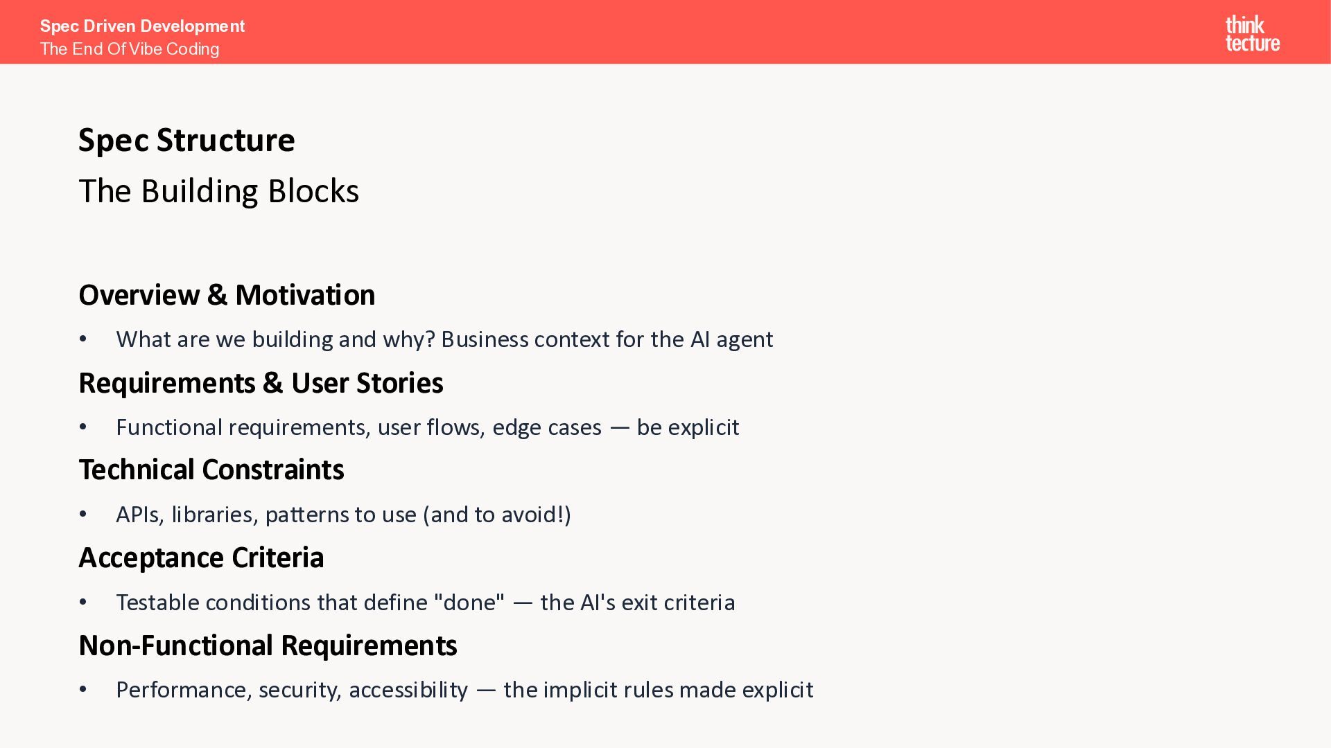 I want a SPA to search and explore Pokémon.” Search & Discovery • Debounced search bar, responsive grid (5/3/2 cols), infinite scroll Pokémon Cards • Image, name, base stats (HP, Attack, Defense, Sp. Atk, Sp. Def, Speed) Detail View • Full profile: types, abilities, height, weight, stats as bar chart Loading & Error Handling • Skeleton placeholders while loading; user-friendly error messages Spec Driven Development The End Of Vibe Coding The Spec