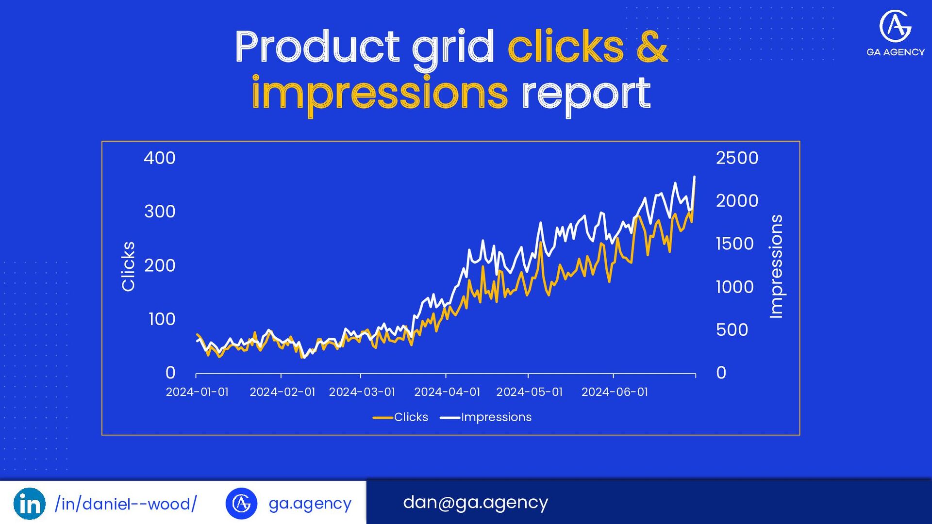 100 200 300 400 2024-01-01 2024-02-01 2024-03-01 2024-04-01 2024-05-01 2024-06-01 Impressions Clicks Clicks Impressions Product grid clicks & impressions report