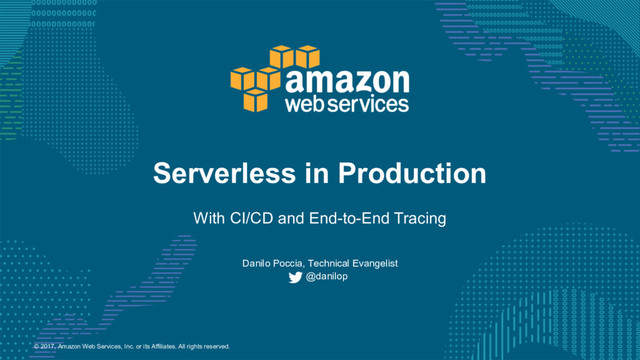 In this session I will share some of the best practices to use serverless applications in production on AWS, using AWS CodeStar to set up your entire continuous integration and delivery toolchain in minutes, allowing you to start releasing code faster and supporting agile development. As your distributed application scales in size and complexity, we’ll see how to use AWS X-Ray, either in development or in production, to introduce end-to-end tracing capabilities and help identify performance bottlenecks, edge case errors, and other hard to detect issues .