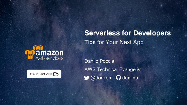 upload it to the AWS cloud. AWS Lambda responds to the events triggered by your application or your users, and auto- matically manages the underlying computer resources for you. Back-end tasks like analyzing a new document or processing requests from a mobile app are easy to implement. Your ap- plication is divided into small functions, leading naturally to a reactive architecture and the adoption of microservices. AWS Lambda in Action is an example-driven tutorial that teaches you how to build applications that use an event-driven approach on the back-end. Starting with an overview of AWS Lambda, the book moves on to show you common examples and patterns that you can use to call Lambda functions from a web page or a mobile app. The second part of the book puts these smaller examples together to build larger applications. By the end, you’ll be ready to create applications that take advantage of the high availability, security, performance, and scalability of AWS. What’s Inside • Create a simple API • Create an event-driven media sharing application • Secure access to your application in the cloud • Use functions from different clients like web pages or mobile apps • Connect your application with external services Requires basic knowledge of JavaScript. Some examples are also provided in Python. No AWS experience is assumed. Danilo Poccia is a technical evangelist at Amazon Web Services and a frequent speaker at public events and workshops. To download their free eBook in PDF, ePub, and Kindle formats, owners of this book should visit www.manning.com/books/aws-lambda-in-action $49.99 / Can $57.99 [INCLUDING eBOOK] AWS Lambda IN ACTION SOFTWARE DEVELOPMENT/CLOUD Danilo Poccia M A N N I N G AWS Lambda IN ACTION MANNING “Clear and concise … the code samples are as well structured as the writing.” —From the Foreword by James Governor, RedMonk “A superb guide to an important aspect of AWS.” —Ben Leibert, VillageReach “Step-by-step examples and clear prose make this the go-to book for AWS Lambda!.” —Dan Kacenjar, Wolters Kluwer “Like Lambda itself, this book is easy to follow, concise, and very functional.” —Christopher Haupt, New Relic M A N N I N G SEE INSERT Danilo Poccia FOREWORD BY James Governor Event-driven serverless applications