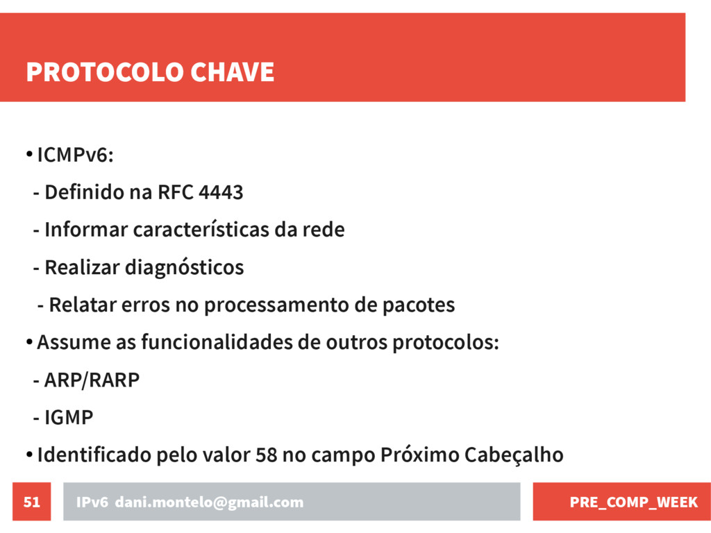 na RFC 4443 - Informar características da rede - Realizar diagnósticos - Relatar erros no processamento de pacotes • Assume as funcionalidades de outros protocolos: - ARP/RARP - IGMP • Identificado pelo valor 58 no campo Próximo Cabeçalho