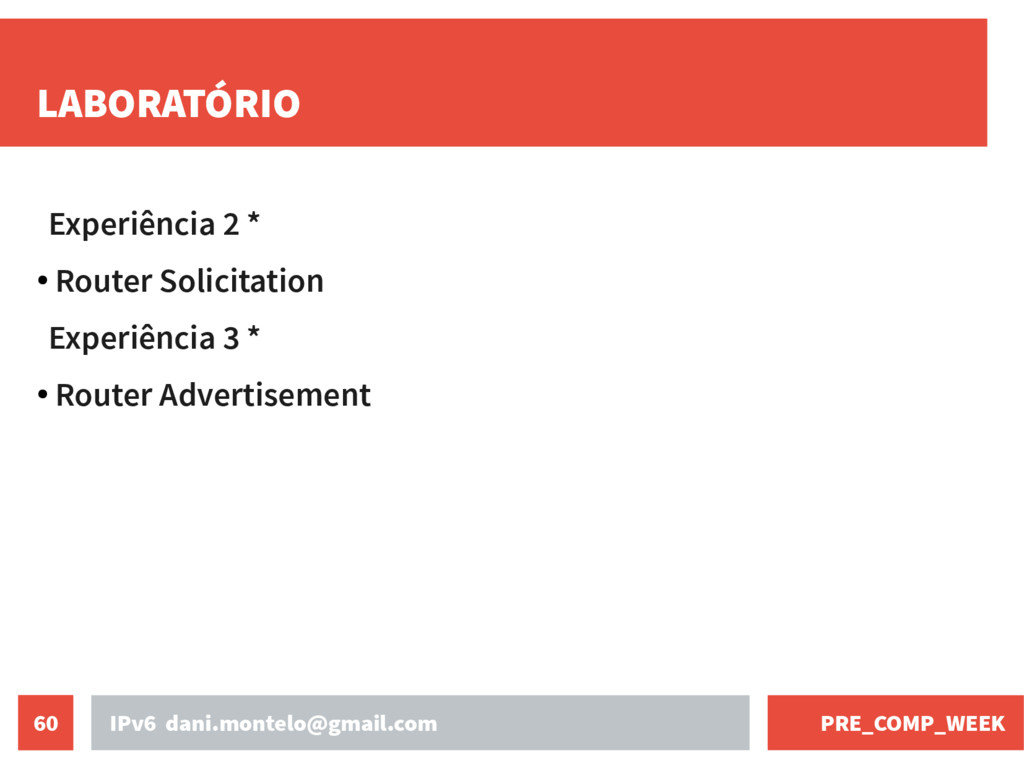definido na RFC 4861 • Torna mais dinâmico alguns processos de configuração de rede: - determinar o endereço MAC dos nós da rede - encontrar roteadores vizinhos - determinar prefixos e outras informações de configuração da rede - detectar endereços duplicados - determinar a acessibilidades dos roteadores - redirecionamento de pacotes - autoconfiguração de endereços - Descoberta de Vizinhança