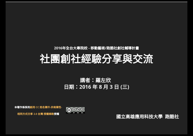 8 月 3 日 ( 三) 本著作係採用 授權 創用 CC 姓名標示- 非商業性- 相同方式分享 3.0 台灣 授權條款 講者:羅左欣