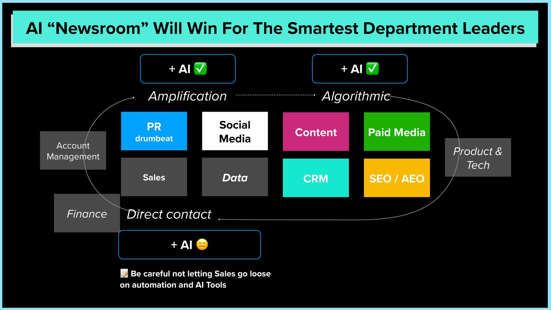 - Develop an “AI Newsroom” approach, blending human curation with AI-driven amplification, PR, social and paid media execution.