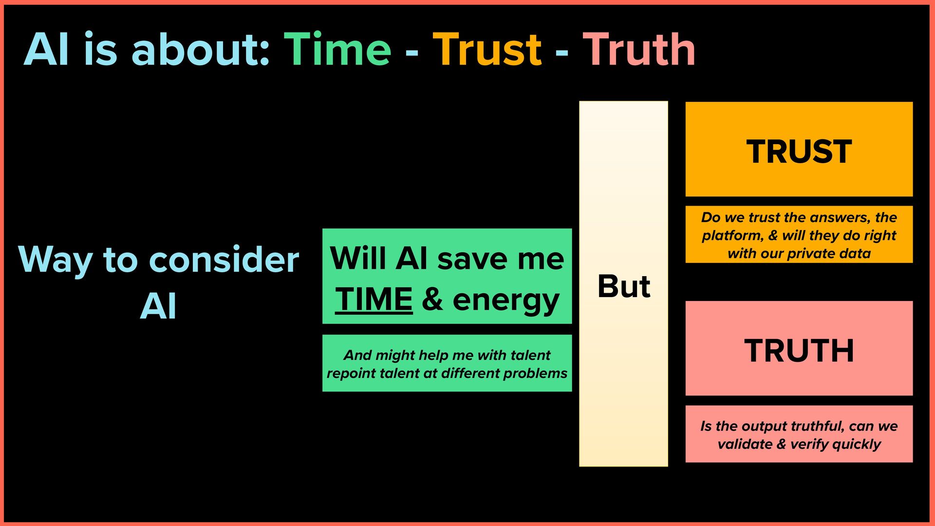 1. “AI revolves around 3T’s: ‘Time, Trust, Truth’—always validate and verify before deploying.”