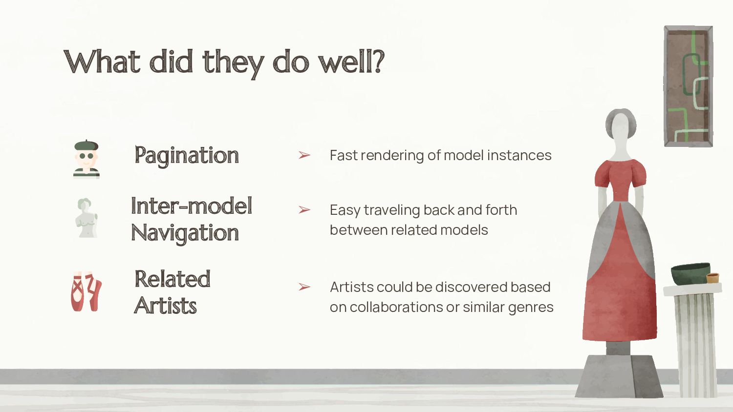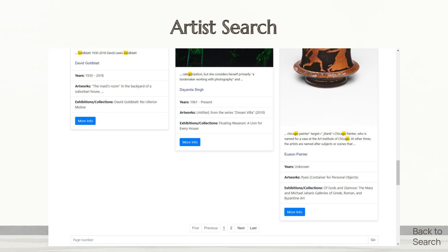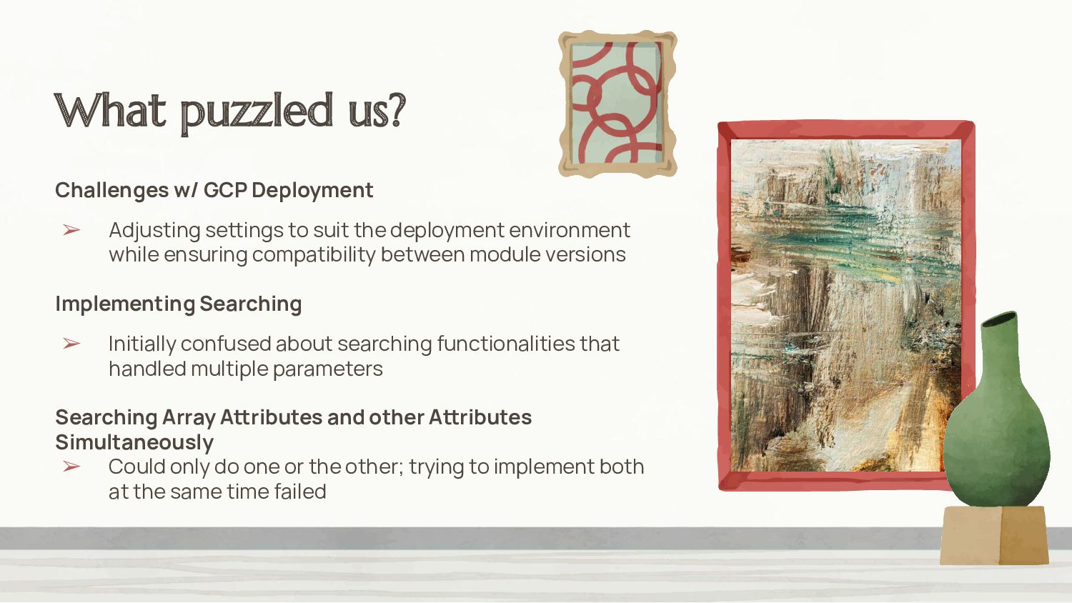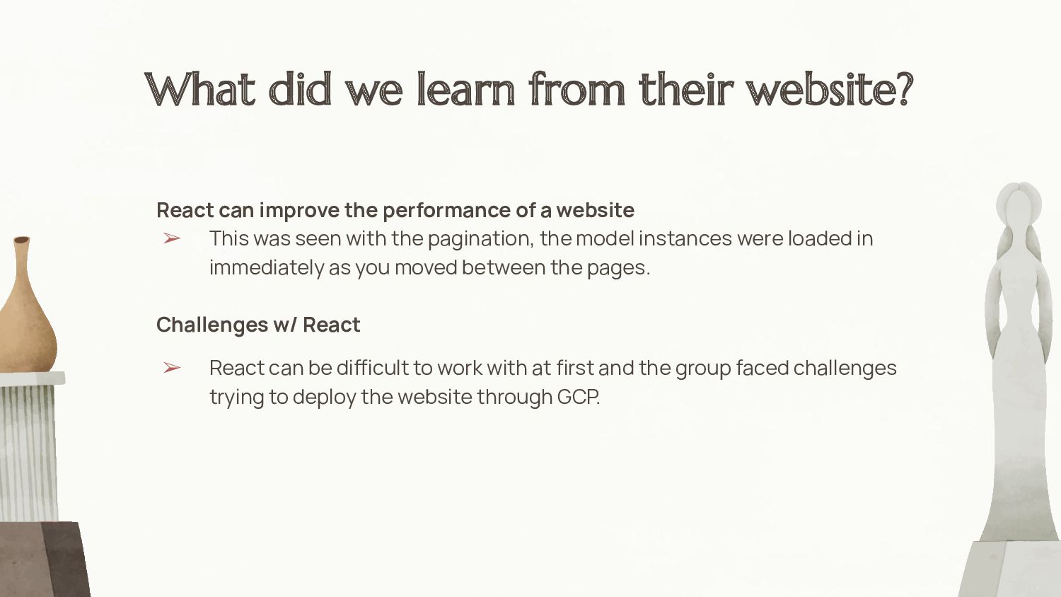 the performance of a website ➢ This was seen with the pagination, the model instances were loaded in immediately as you moved between the pages. Challenges w/ React ➢ React can be diicult to work with at first and the group faced challenges trying to deploy the website through GCP.