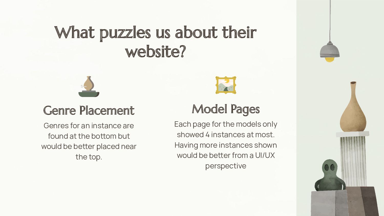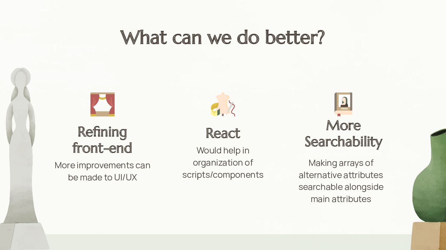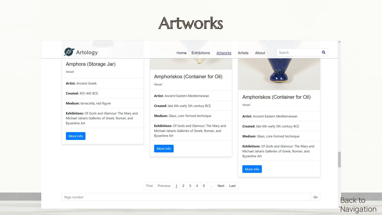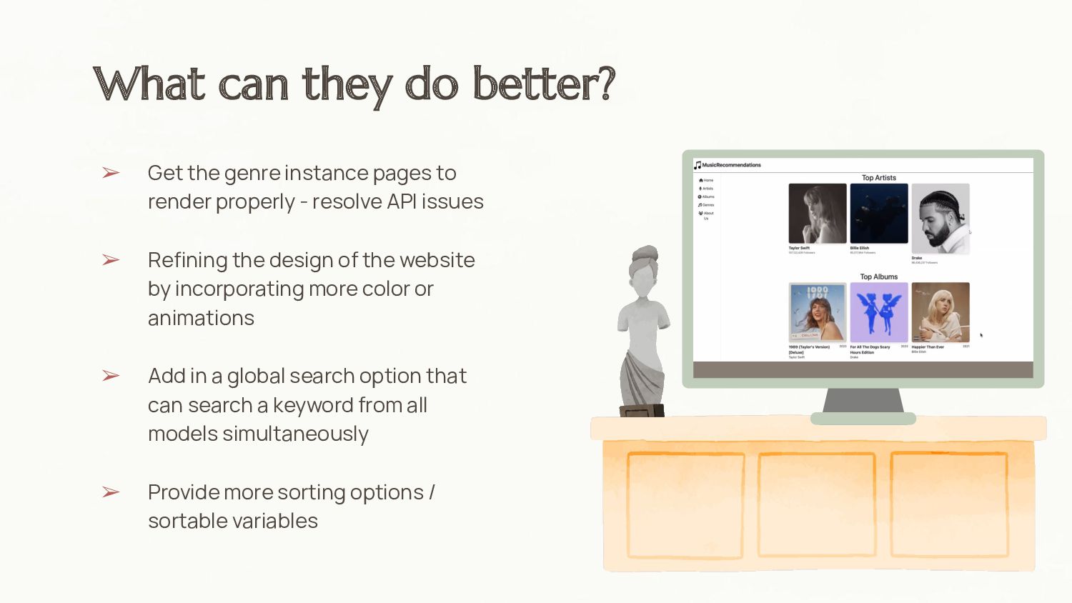 the performance of a website ➢ This was seen with the pagination, the model instances were loaded in immediately as you moved between the pages. Challenges w/ React ➢ React can be diicult to work with at first and the group faced challenges trying to deploy the website through GCP.