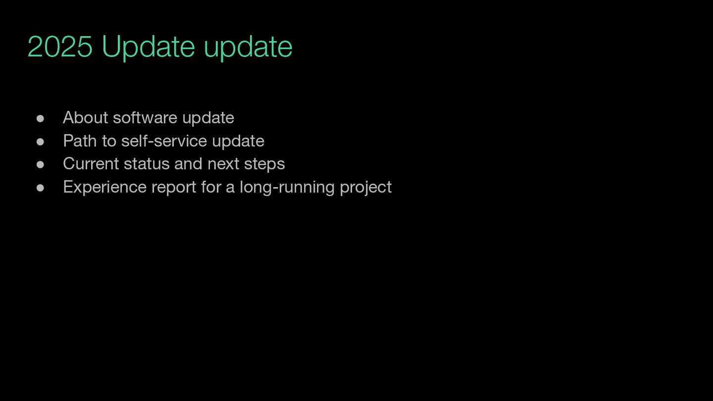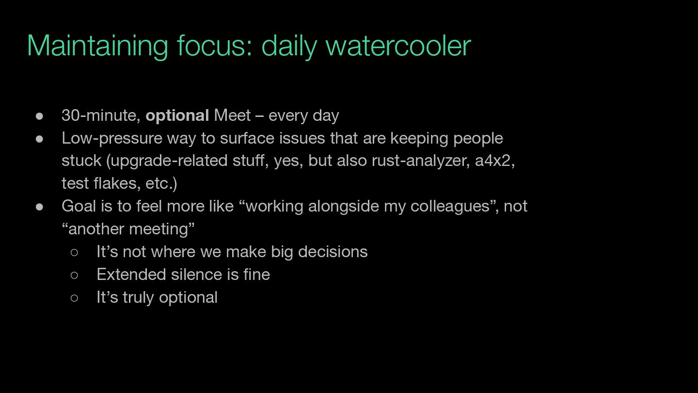 day • Low-pressure way to surface issues that are keeping people stuck (upgrade-related stuff, yes, but also rust-analyzer, a4x2, test flakes, etc.) • Goal is to feel more like “working alongside my colleagues”, not “another meeting” ◦ It’s not where we make big decisions ◦ Extended silence is fine ◦ It’s truly optional