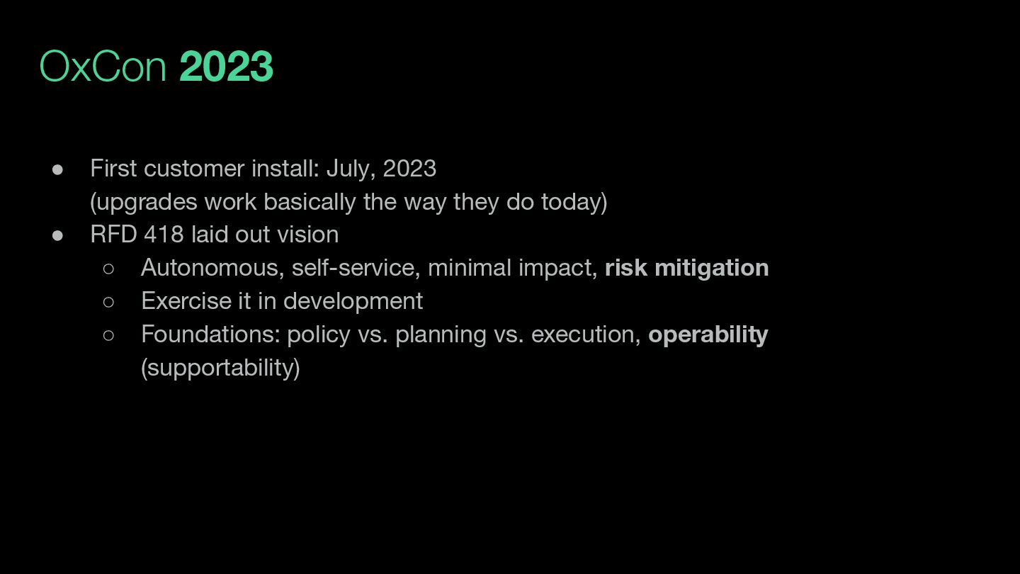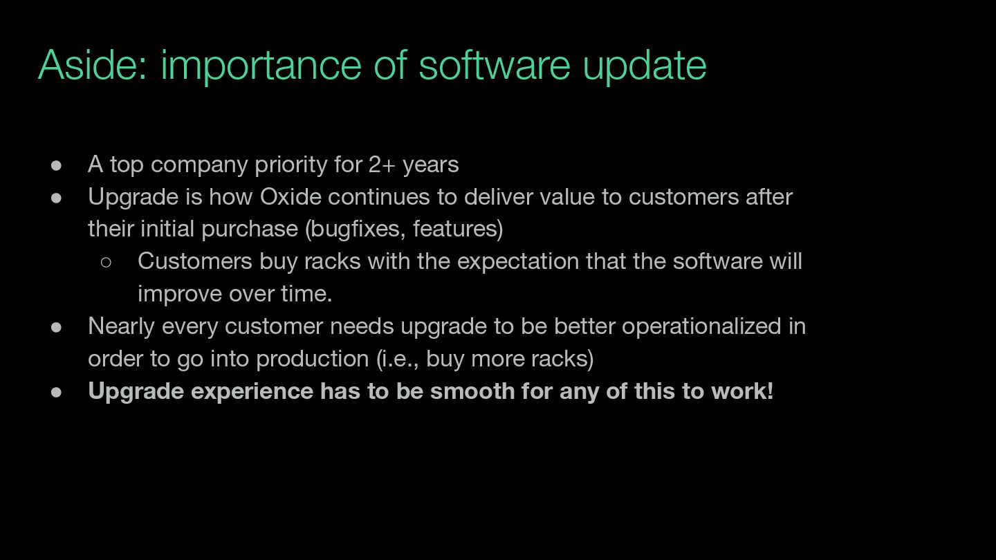 for 2+ years • Upgrade is how Oxide continues to deliver value to customers after their initial purchase (bugfixes, features) ◦ Customers buy racks with the expectation that the software will improve over time. • Nearly every customer needs upgrade to be better operationalized in order to go into production (i.e., buy more racks) • Upgrade experience has to be smooth for any of this to work!
