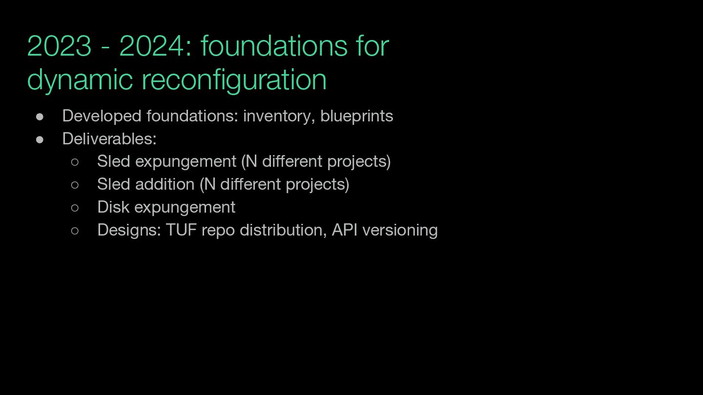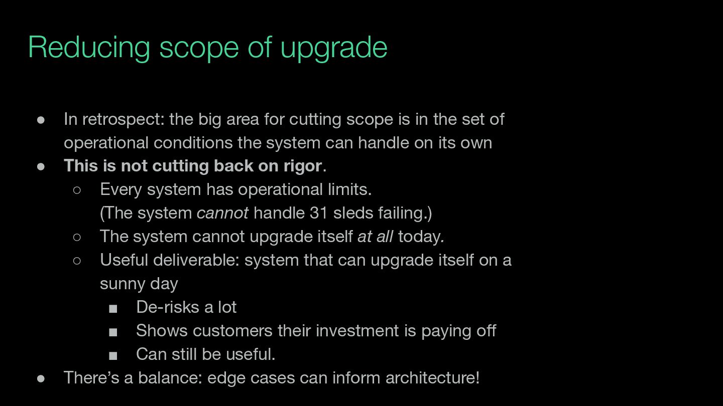 for cutting scope is in the set of operational conditions the system can handle on its own • This is not cutting back on rigor. ◦ Every system has operational limits. (The system cannot handle 31 sleds failing.) ◦ The system cannot upgrade itself at all today. ◦ Useful deliverable: system that can upgrade itself on a sunny day ▪ De-risks a lot ▪ Shows customers their investment is paying off ▪ Can still be useful. • There’s a balance: edge cases can inform architecture!