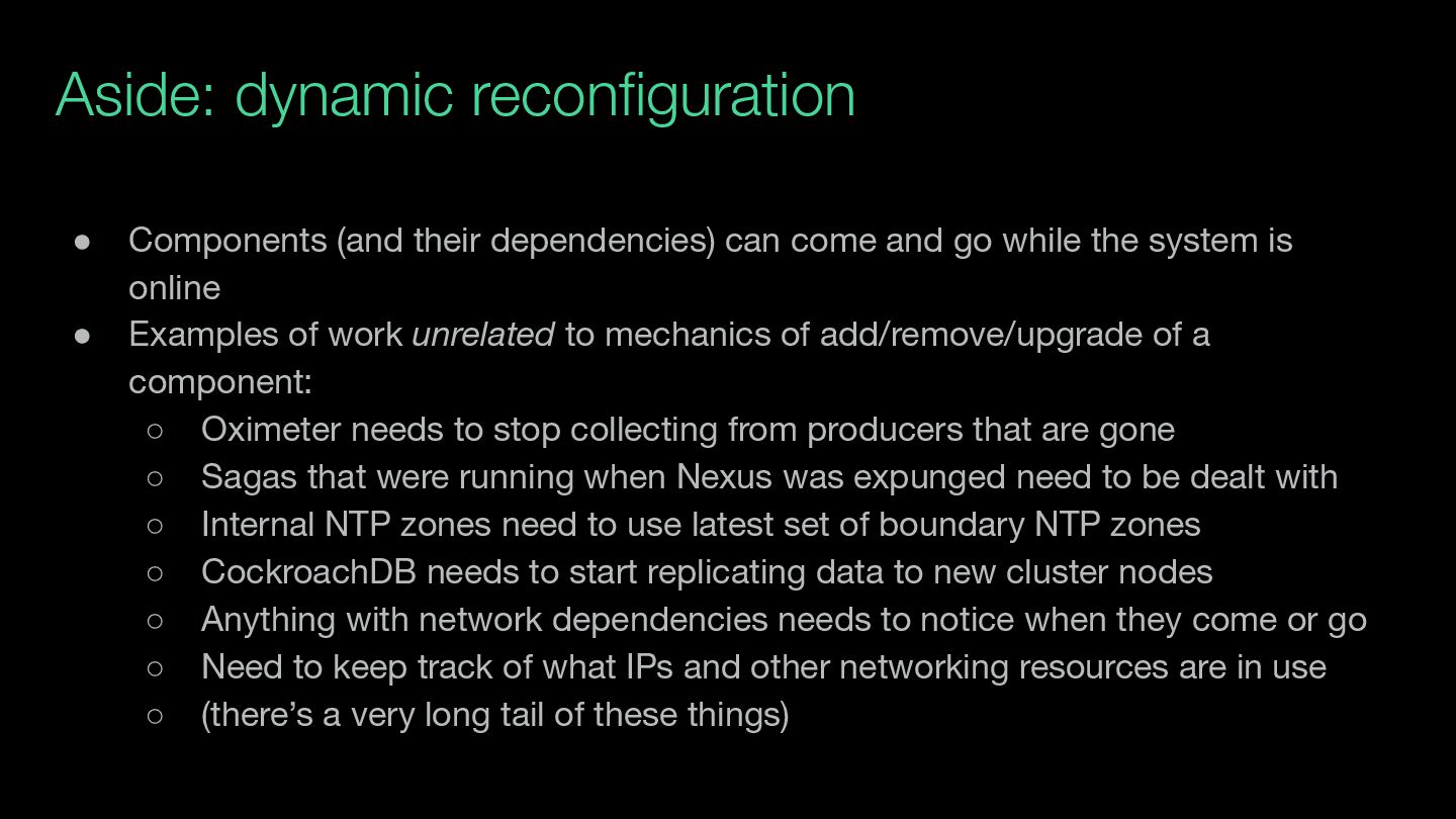 and go while the system is online • Examples of work unrelated to mechanics of add/remove/upgrade of a component: ◦ Oximeter needs to stop collecting from producers that are gone ◦ Sagas that were running when Nexus was expunged need to be dealt with ◦ Internal NTP zones need to use latest set of boundary NTP zones ◦ CockroachDB needs to start replicating data to new cluster nodes ◦ Anything with network dependencies needs to notice when they come or go ◦ Need to keep track of what IPs and other networking resources are in use ◦ (there’s a very long tail of these things)