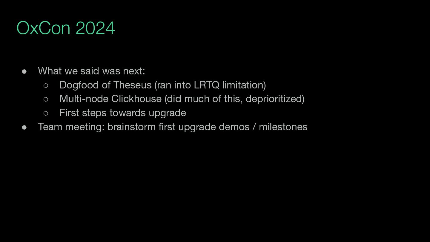 of Theseus (ran into LRTQ limitation) ◦ Multi-node Clickhouse (did much of this, deprioritized) ◦ First steps towards upgrade • Team meeting: brainstorm first upgrade demos / milestones