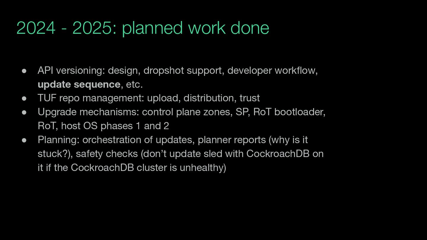 dropshot support, developer workflow, update sequence, etc. • TUF repo management: upload, distribution, trust • Upgrade mechanisms: control plane zones, SP, RoT bootloader, RoT, host OS phases 1 and 2 • Planning: orchestration of updates, planner reports (why is it stuck?), safety checks (don’t update sled with CockroachDB on it if the CockroachDB cluster is unhealthy)