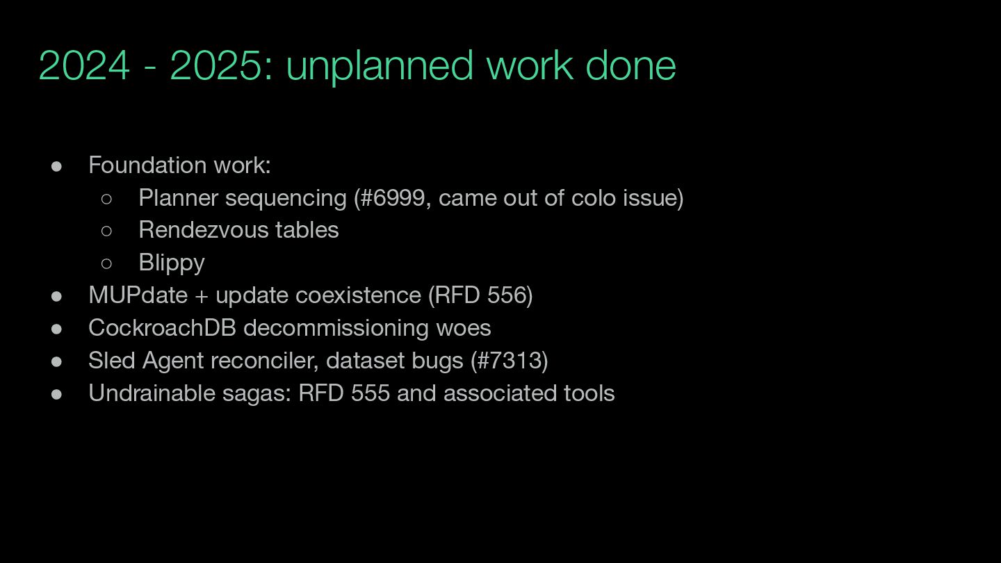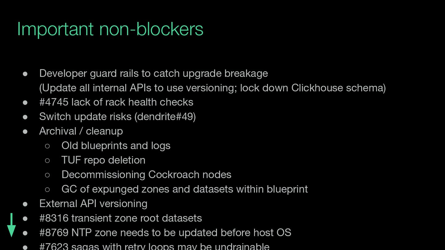 (Update all internal APIs to use versioning; lock down Clickhouse schema) • #4745 lack of rack health checks • Switch update risks (dendrite#49) • Archival / cleanup ◦ Old blueprints and logs ◦ TUF repo deletion ◦ Decommissioning Cockroach nodes ◦ GC of expunged zones and datasets within blueprint • External API versioning • #8316 transient zone root datasets • #8769 NTP zone needs to be updated before host OS