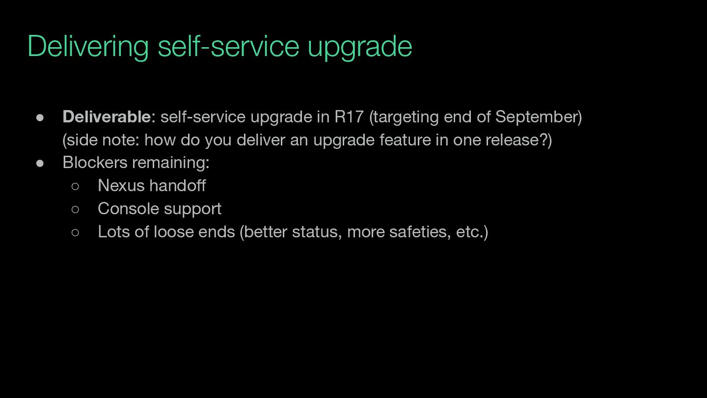 end of September) (side note: how do you deliver an upgrade feature in one release?) • Blockers remaining: ◦ Nexus handoff ◦ Console support ◦ Lots of loose ends (better status, more safeties, etc.)