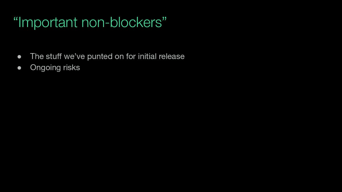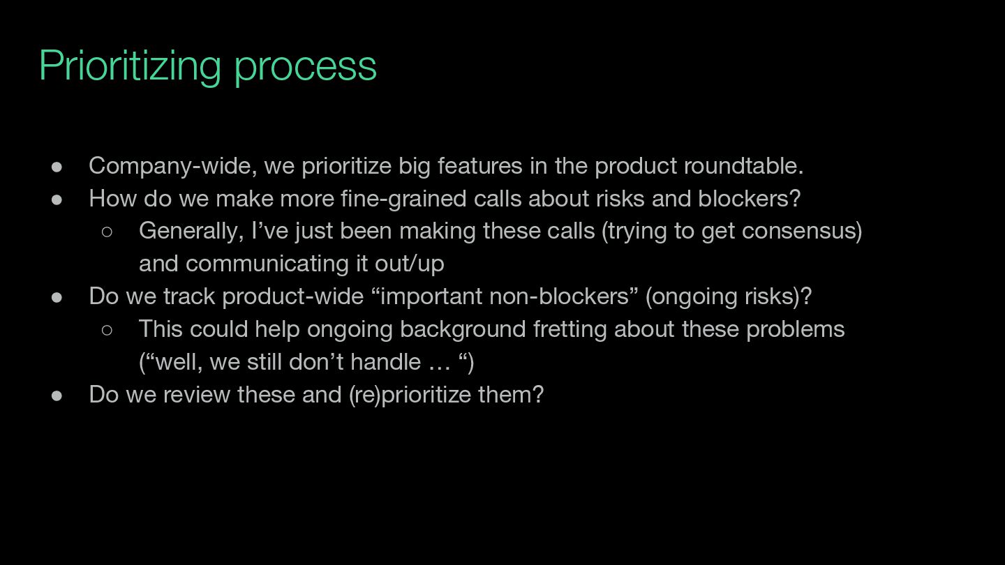 product roundtable. • How do we make more fine-grained calls about risks and blockers? ◦ Generally, I’ve just been making these calls (trying to get consensus) and communicating it out/up • Do we track product-wide “important non-blockers” (ongoing risks)? ◦ This could help ongoing background fretting about these problems (“well, we still don’t handle … “) • Do we review these and (re)prioritize them?