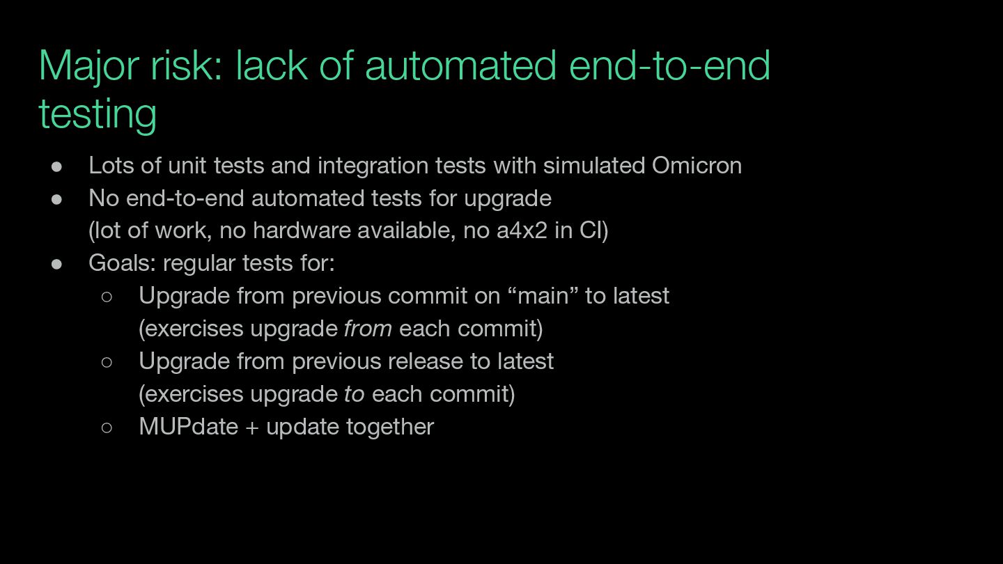 unit tests and integration tests with simulated Omicron • No end-to-end automated tests for upgrade (lot of work, no hardware available, no a4x2 in CI) • Goals: regular tests for: ◦ Upgrade from previous commit on “main” to latest (exercises upgrade from each commit) ◦ Upgrade from previous release to latest (exercises upgrade to each commit) ◦ MUPdate + update together