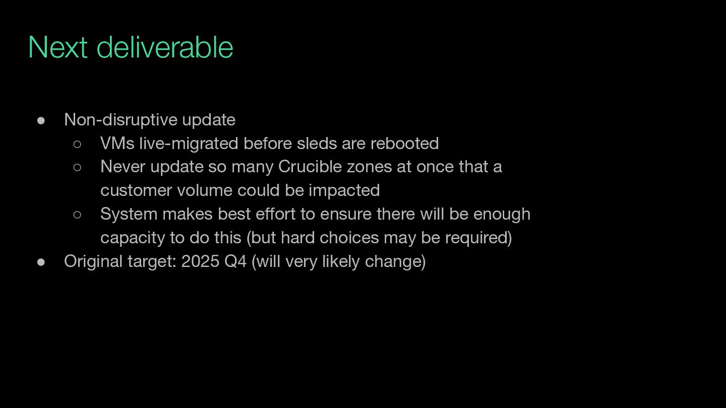 are rebooted ◦ Never update so many Crucible zones at once that a customer volume could be impacted ◦ System makes best effort to ensure there will be enough capacity to do this (but hard choices may be required) • Original target: 2025 Q4 (will very likely change)
