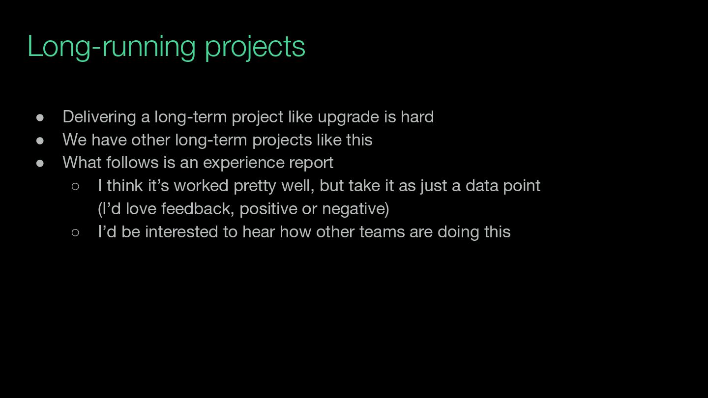 hard • We have other long-term projects like this • What follows is an experience report ◦ I think it’s worked pretty well, but take it as just a data point (I’d love feedback, positive or negative) ◦ I’d be interested to hear how other teams are doing this