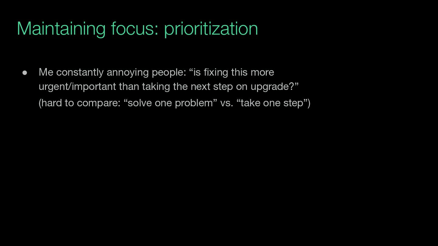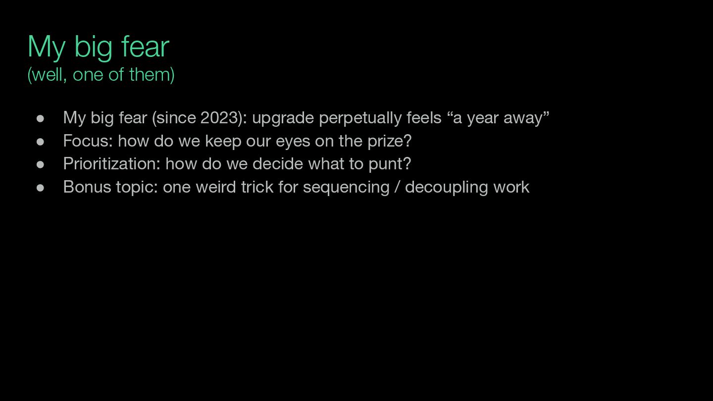 fear (since 2023): upgrade perpetually feels “a year away” • Focus: how do we keep our eyes on the prize? • Prioritization: how do we decide what to punt? • Bonus topic: one weird trick for sequencing / decoupling work