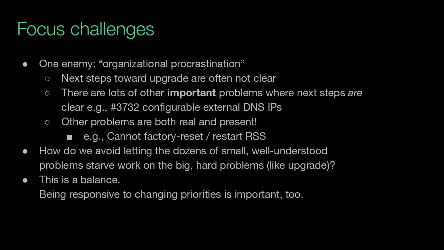 toward upgrade are often not clear ◦ There are lots of other important problems where next steps are clear e.g., #3732 configurable external DNS IPs ◦ Other problems are both real and present! ▪ e.g., Cannot factory-reset / restart RSS • How do we avoid letting the dozens of small, well-understood problems starve work on the big, hard problems (like upgrade)? • This is a balance. Being responsive to changing priorities is important, too.