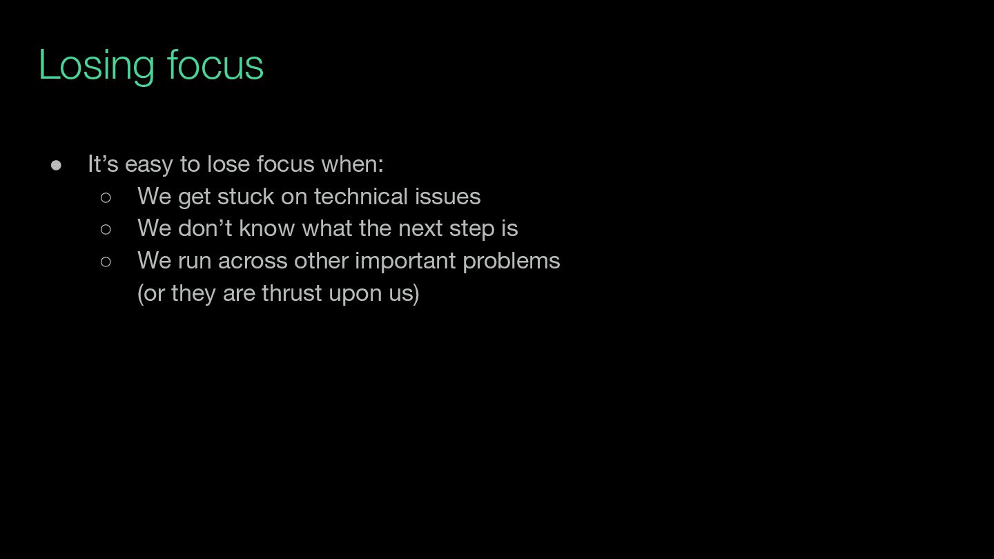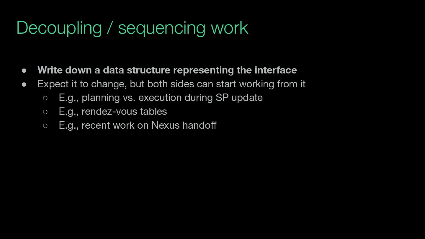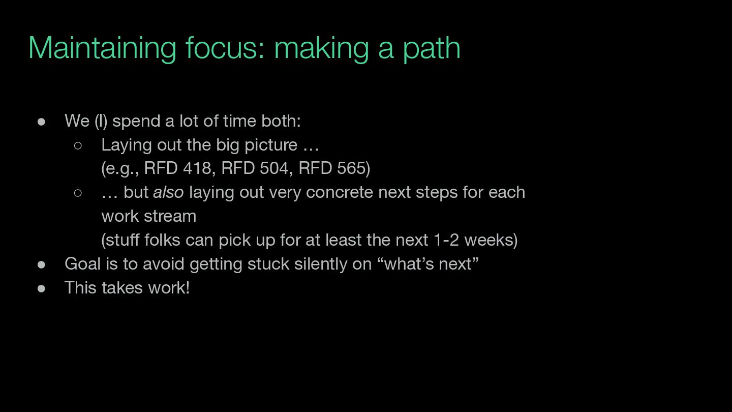 lot of time both: ◦ Laying out the big picture … (e.g., RFD 418, RFD 504, RFD 565) ◦ … but also laying out very concrete next steps for each work stream (stuff folks can pick up for at least the next 1-2 weeks) • Goal is to avoid getting stuck silently on “what’s next” • This takes work!