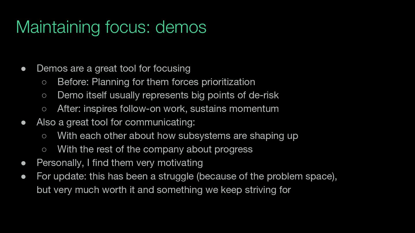 focusing ◦ Before: Planning for them forces prioritization ◦ Demo itself usually represents big points of de-risk ◦ After: inspires follow-on work, sustains momentum • Also a great tool for communicating: ◦ With each other about how subsystems are shaping up ◦ With the rest of the company about progress • Personally, I find them very motivating • For update: this has been a struggle (because of the problem space), but very much worth it and something we keep striving for
