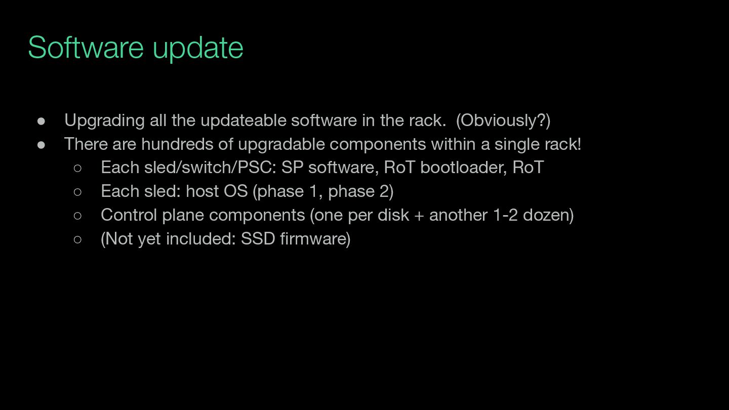 rack. (Obviously?) • There are hundreds of upgradable components within a single rack! ◦ Each sled/switch/PSC: SP software, RoT bootloader, RoT ◦ Each sled: host OS (phase 1, phase 2) ◦ Control plane components (one per disk + another 1-2 dozen) ◦ (Not yet included: SSD firmware)