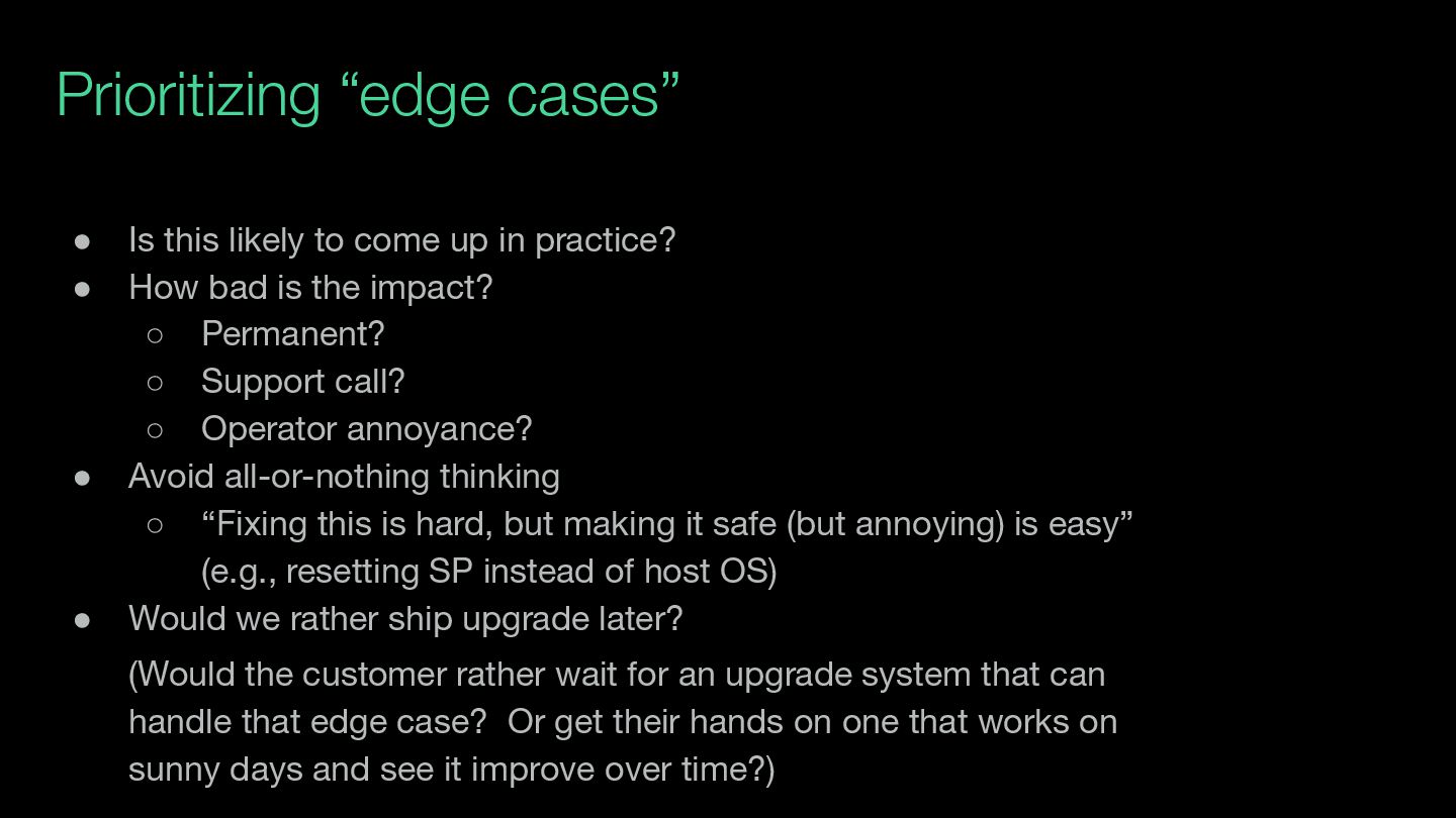 in practice? • How bad is the impact? ◦ Permanent? ◦ Support call? ◦ Operator annoyance? • Avoid all-or-nothing thinking ◦ “Fixing this is hard, but making it safe (but annoying) is easy” (e.g., resetting SP instead of host OS) • Would we rather ship upgrade later? (Would the customer rather wait for an upgrade system that can handle that edge case? Or get their hands on one that works on sunny days and see it improve over time?)