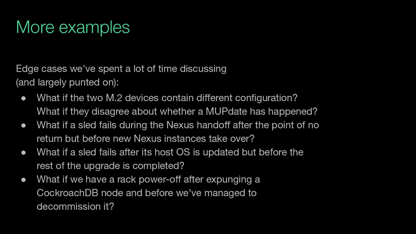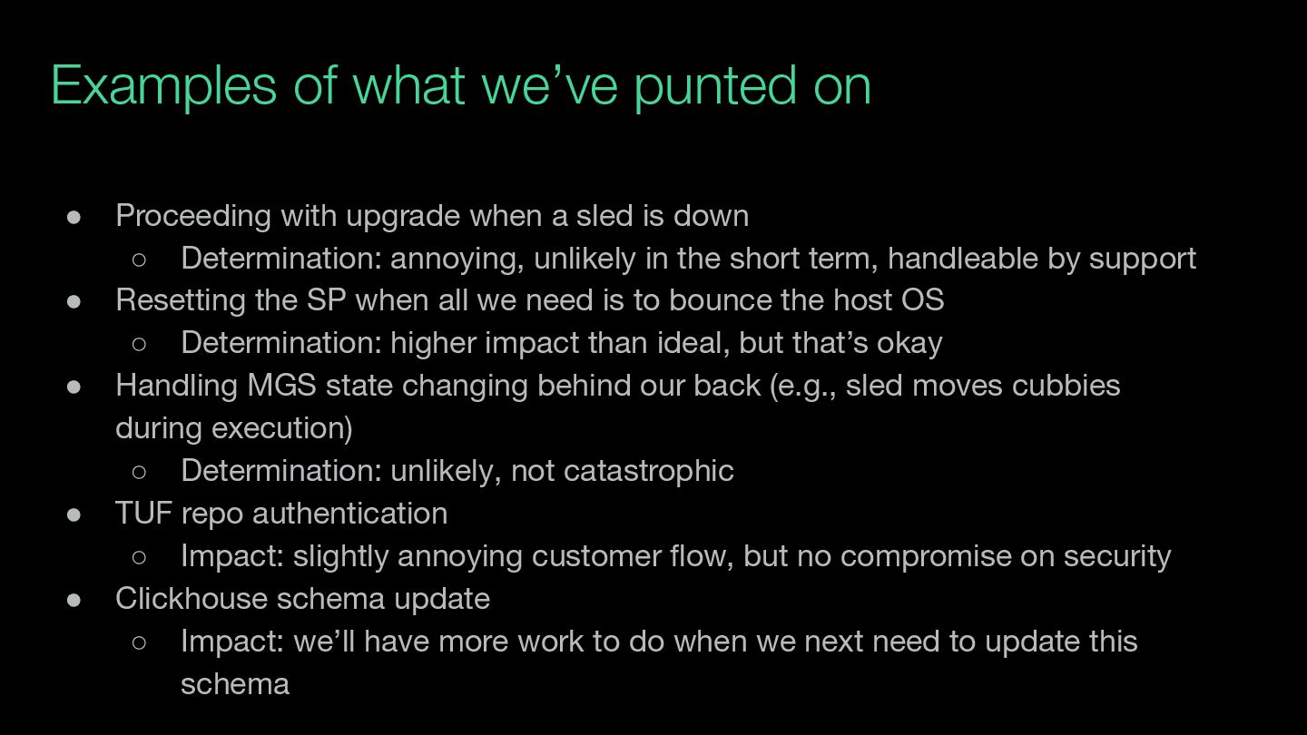 when a sled is down ◦ Determination: annoying, unlikely in the short term, handleable by support • Resetting the SP when all we need is to bounce the host OS ◦ Determination: higher impact than ideal, but that’s okay • Handling MGS state changing behind our back (e.g., sled moves cubbies during execution) ◦ Determination: unlikely, not catastrophic • TUF repo authentication ◦ Impact: slightly annoying customer flow, but no compromise on security • Clickhouse schema update ◦ Impact: we’ll have more work to do when we next need to update this schema