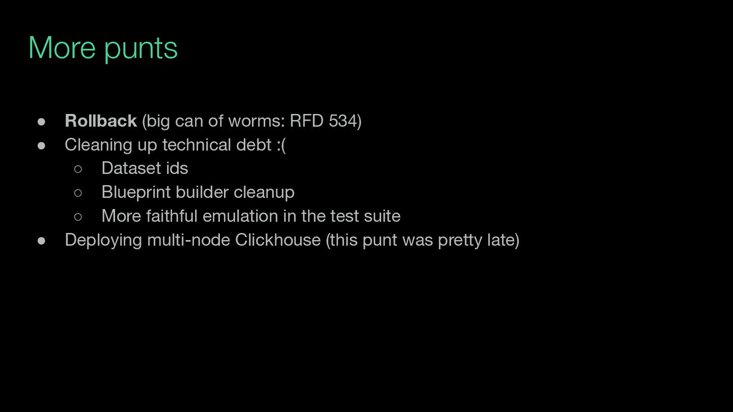 • Cleaning up technical debt :( ◦ Dataset ids ◦ Blueprint builder cleanup ◦ More faithful emulation in the test suite • Deploying multi-node Clickhouse (this punt was pretty late)