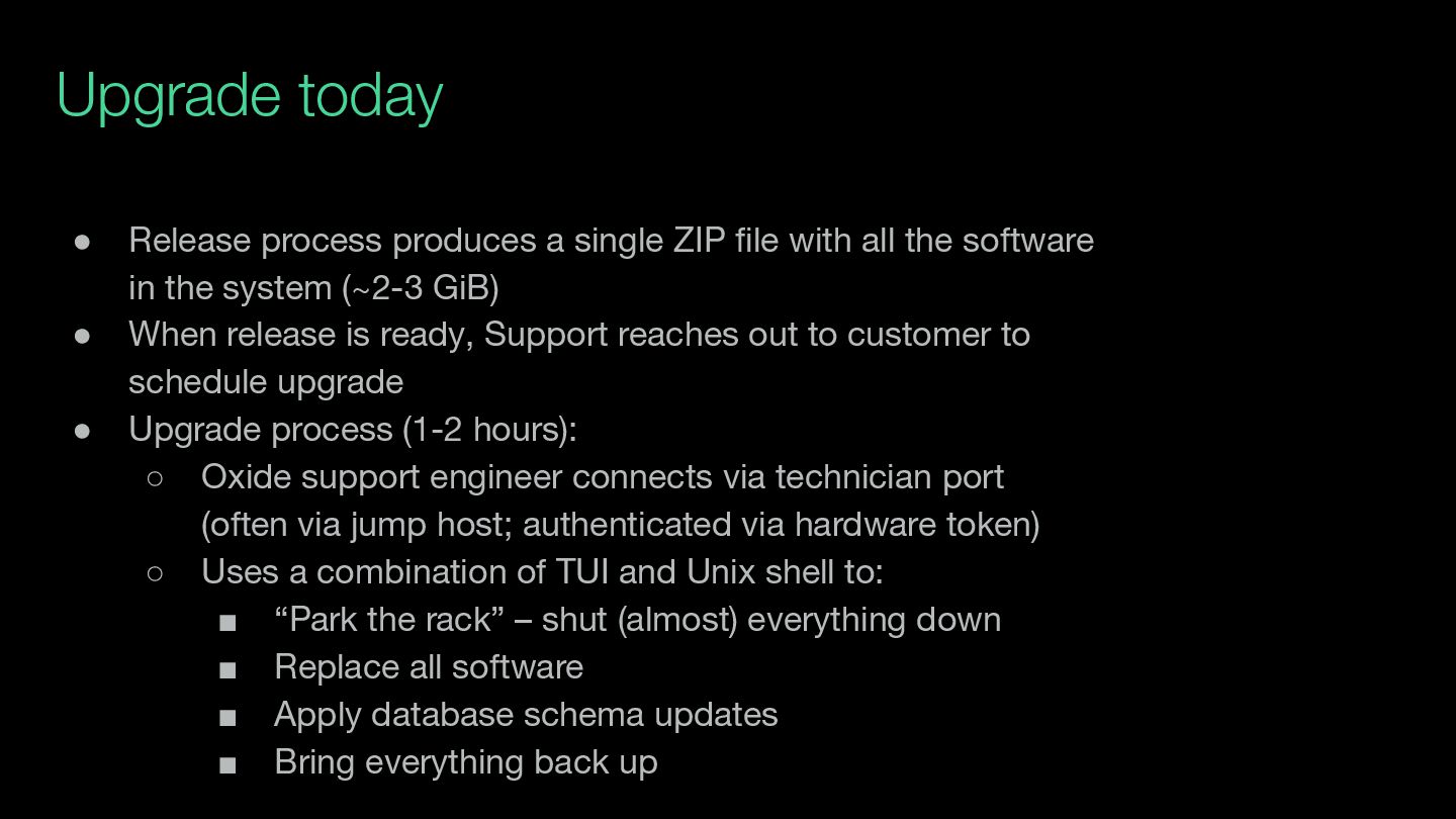 with all the software in the system (~2-3 GiB) • When release is ready, Support reaches out to customer to schedule upgrade • Upgrade process (1-2 hours): ◦ Oxide support engineer connects via technician port (often via jump host; authenticated via hardware token) ◦ Uses a combination of TUI and Unix shell to: ▪ “Park the rack” – shut (almost) everything down ▪ Replace all software ▪ Apply database schema updates ▪ Bring everything back up