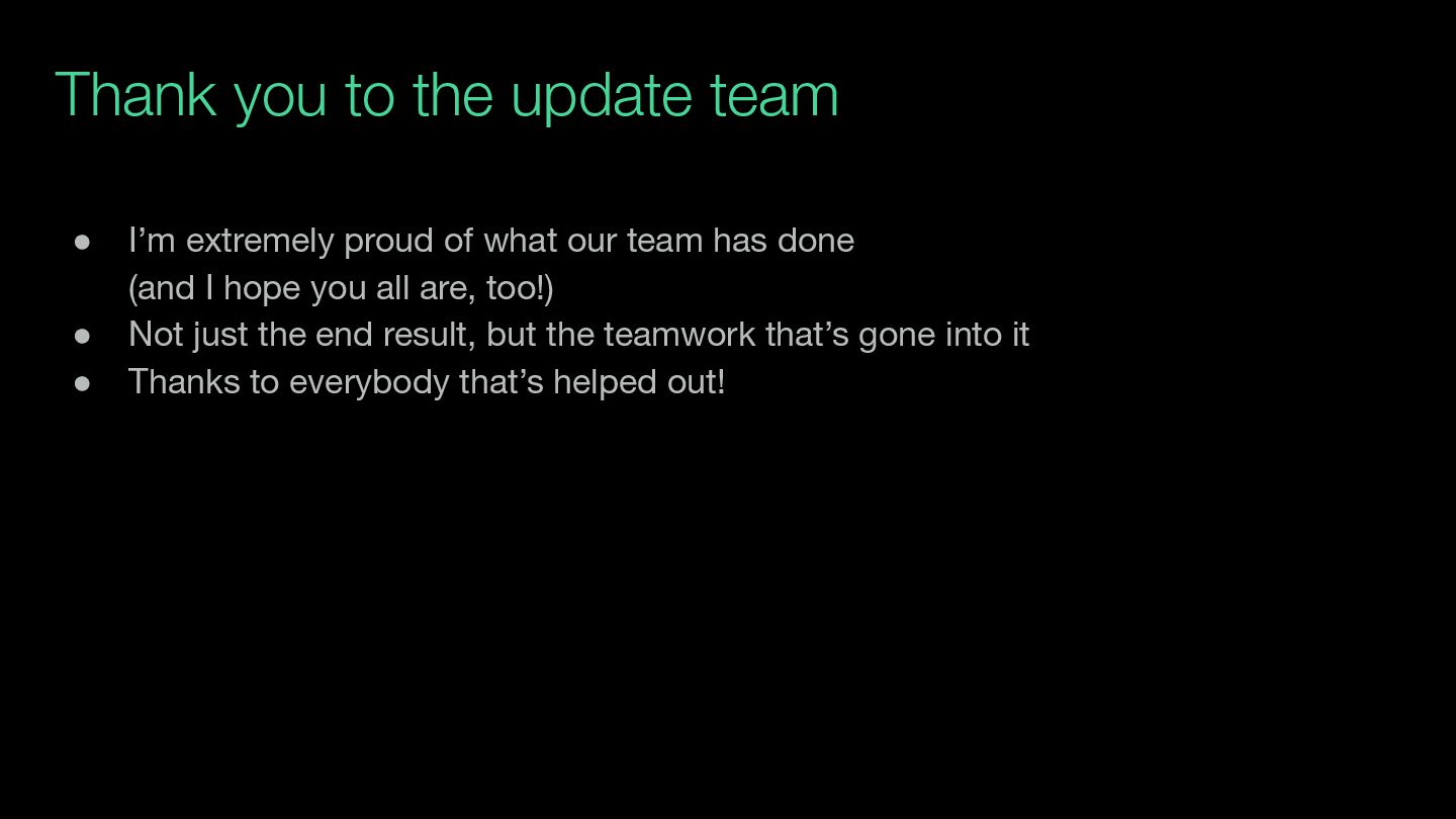 of what our team has done (and I hope you all are, too!) • Not just the end result, but the teamwork that’s gone into it • Thanks to everybody that’s helped out!