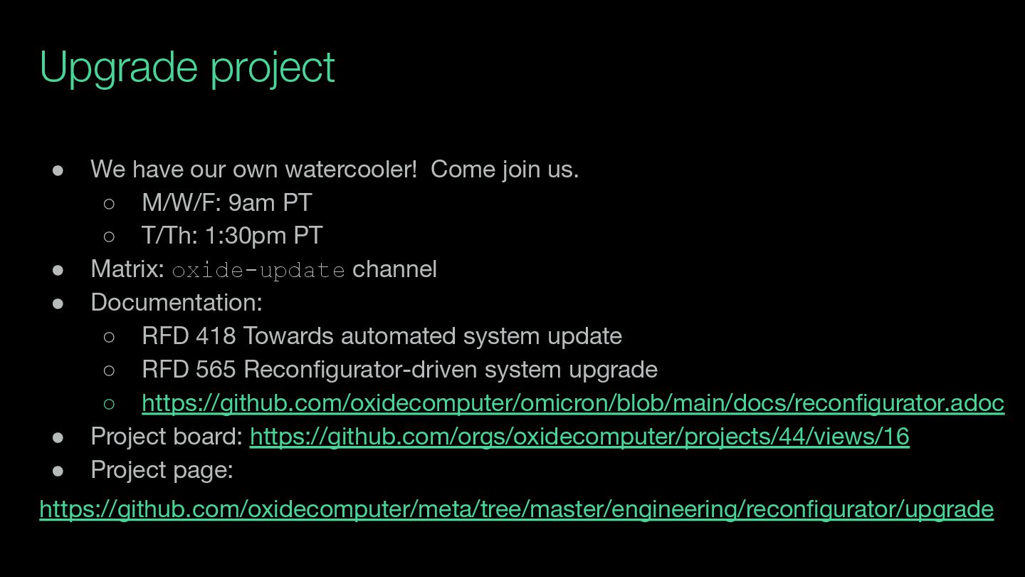 discussing (and largely punted on): • What if the two M.2 devices contain different configuration? What if they disagree about whether a MUPdate has happened? • What if a sled fails during the Nexus handoff after the point of no return but before new Nexus instances take over? • What if a sled fails after its host OS is updated but before the rest of the upgrade is completed? • What if we have a rack power-off after expunging a CockroachDB node and before we’ve managed to decommission it?