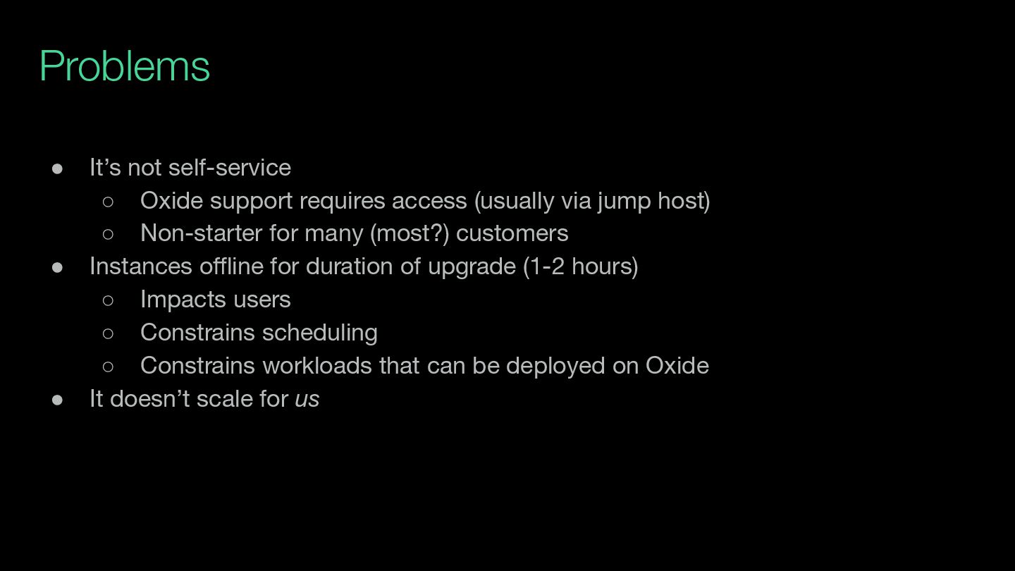 (usually via jump host) ◦ Non-starter for many (most?) customers • Instances offline for duration of upgrade (1-2 hours) ◦ Impacts users ◦ Constrains scheduling ◦ Constrains workloads that can be deployed on Oxide • It doesn’t scale for us