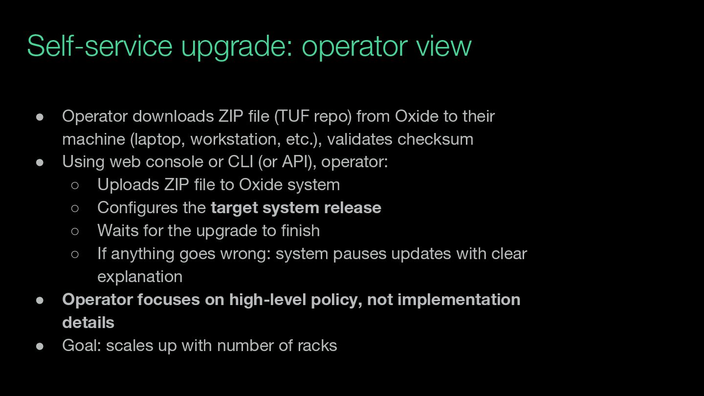 repo) from Oxide to their machine (laptop, workstation, etc.), validates checksum • Using web console or CLI (or API), operator: ◦ Uploads ZIP file to Oxide system ◦ Configures the target system release ◦ Waits for the upgrade to finish ◦ If anything goes wrong: system pauses updates with clear explanation • Operator focuses on high-level policy, not implementation details • Goal: scales up with number of racks