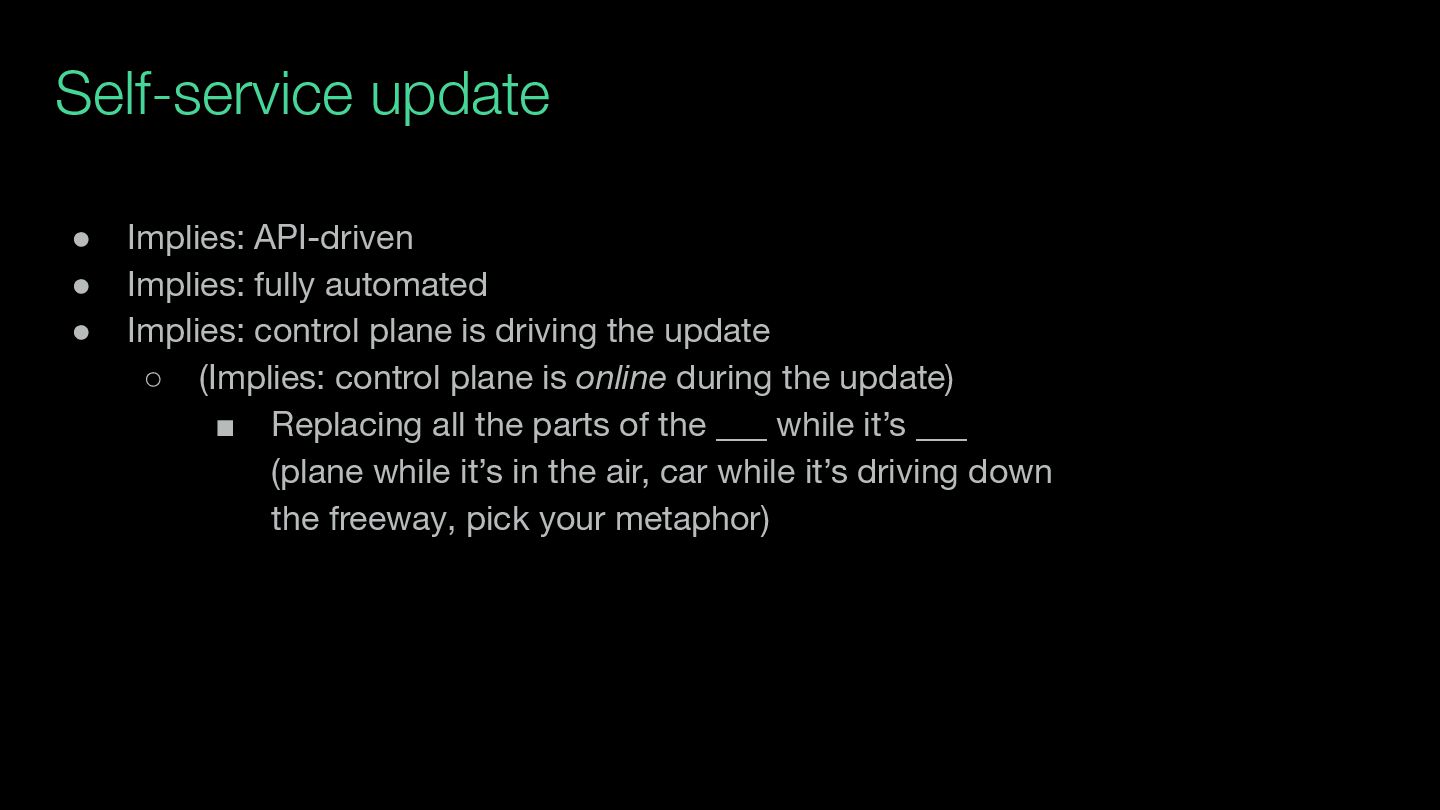 Implies: control plane is driving the update ◦ (Implies: control plane is online during the update) ▪ Replacing all the parts of the ___ while it’s ___ (plane while it’s in the air, car while it’s driving down the freeway, pick your metaphor)